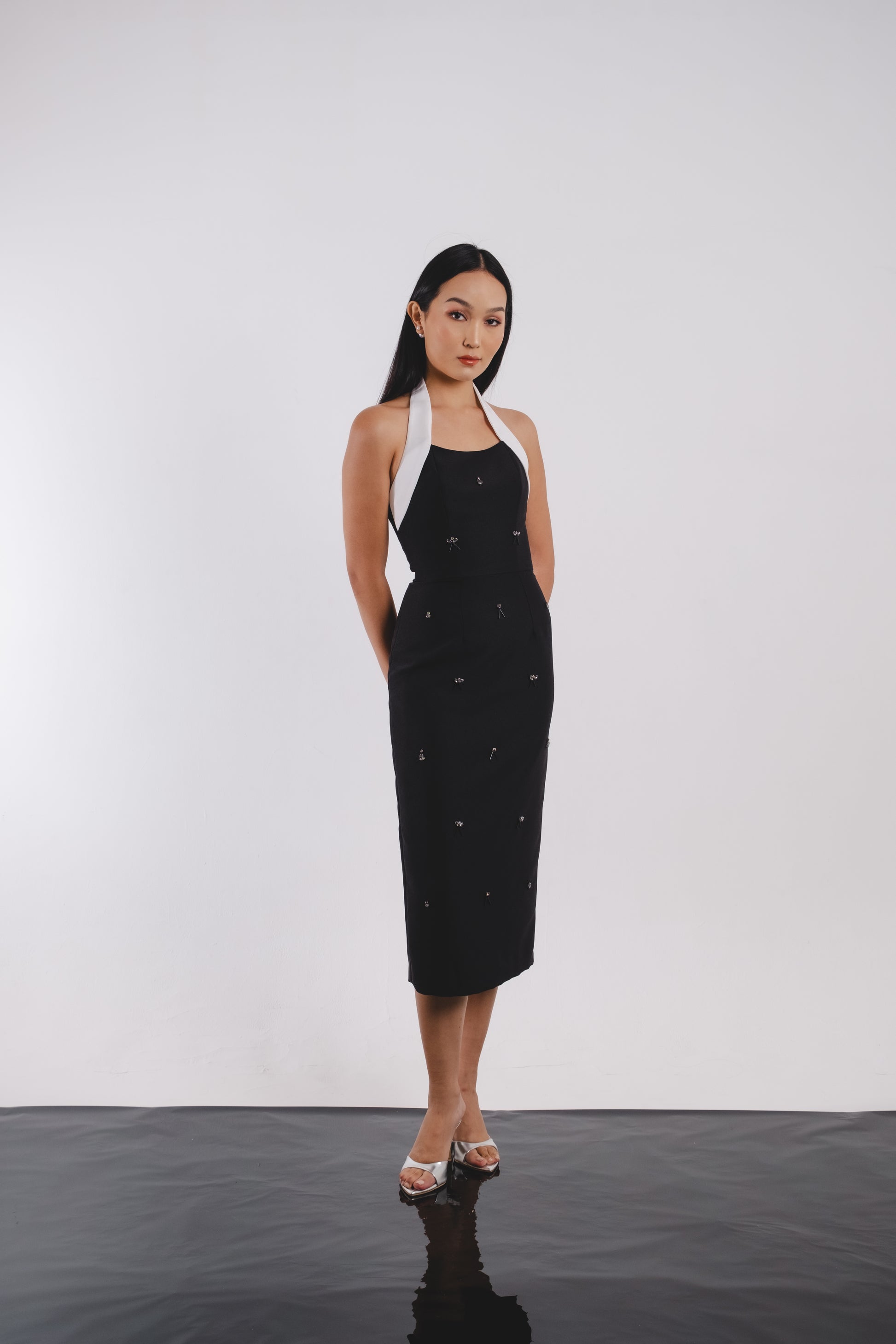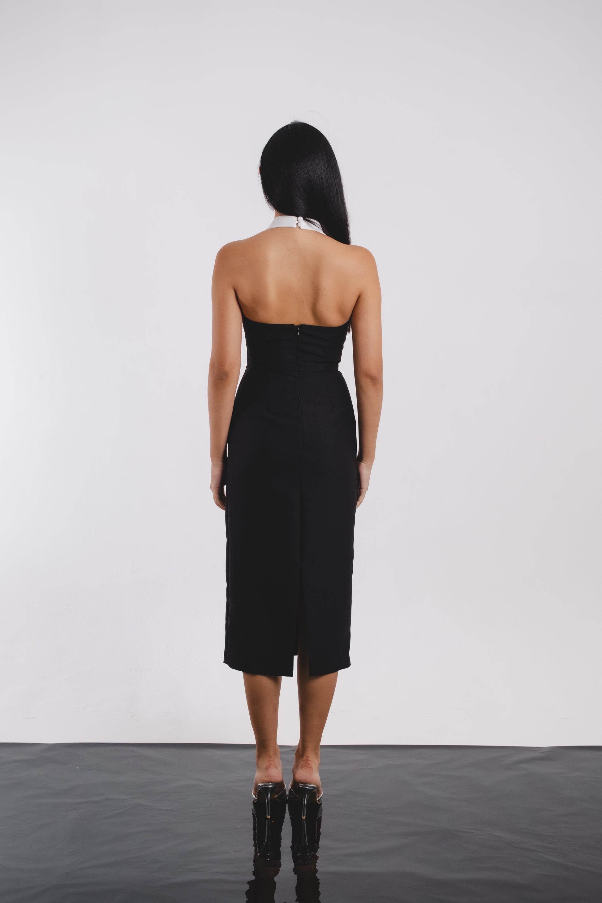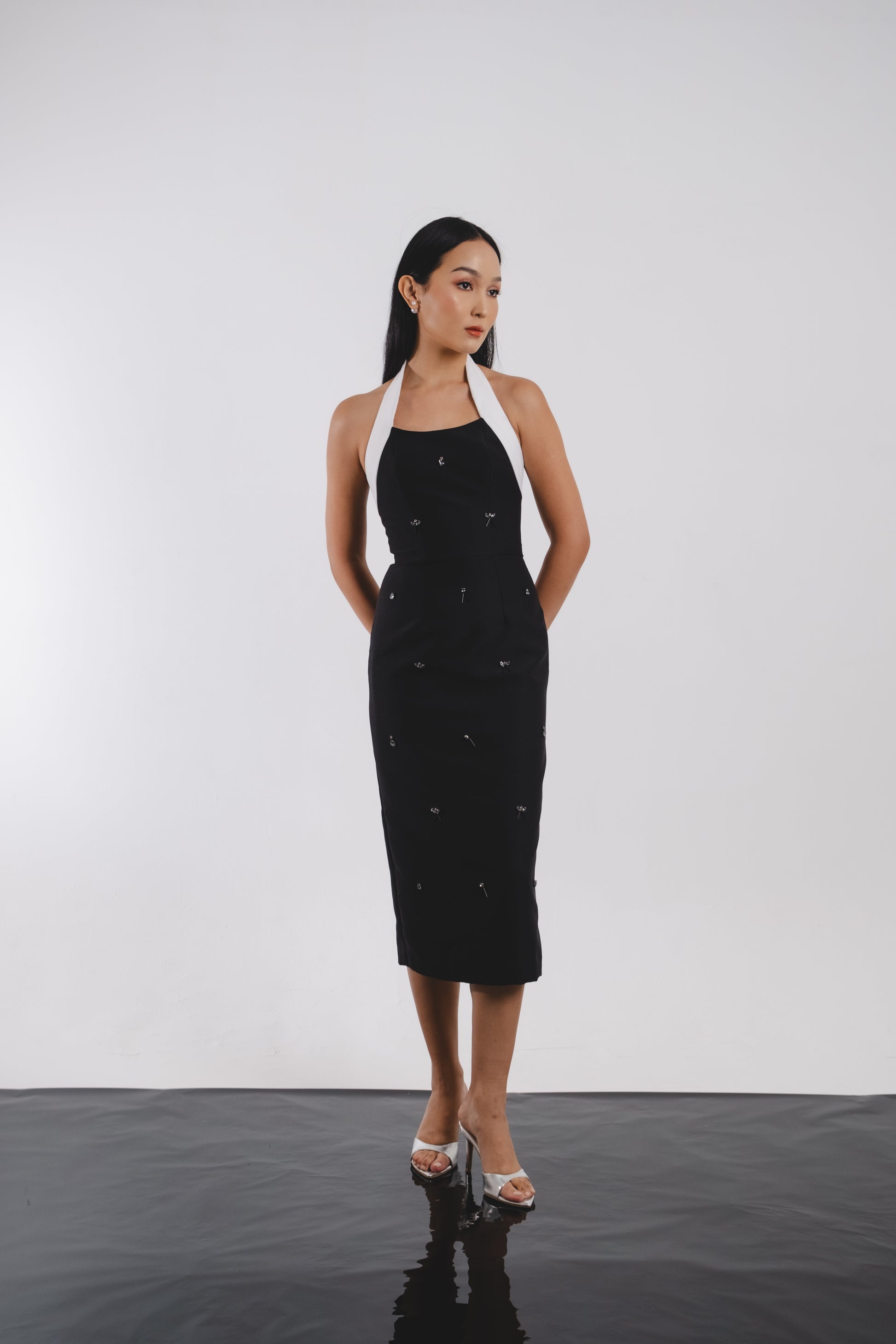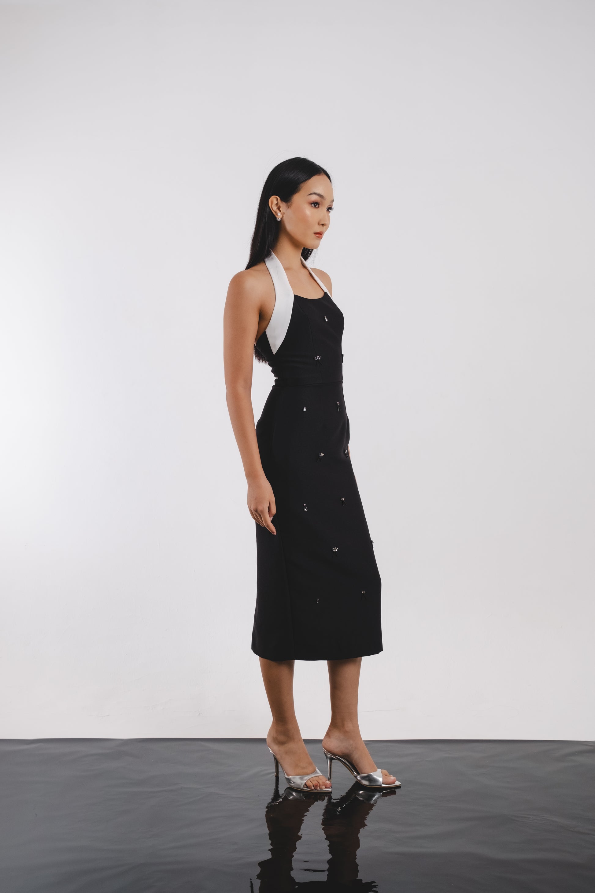 Discover timeless elegance and sophistication with our Alexis Dress. This stunning midi dress features a chic black design, accented by a white halter neck for a touch of contrast. The fitted silhouette ensures a flattering look, while delicate bead detailing adds a touch of glamour.