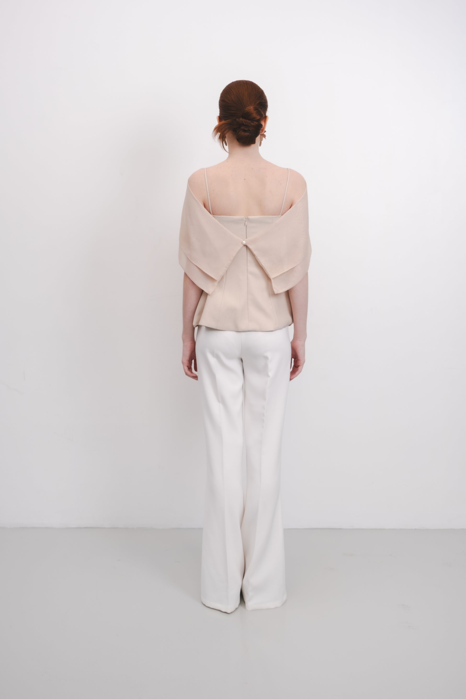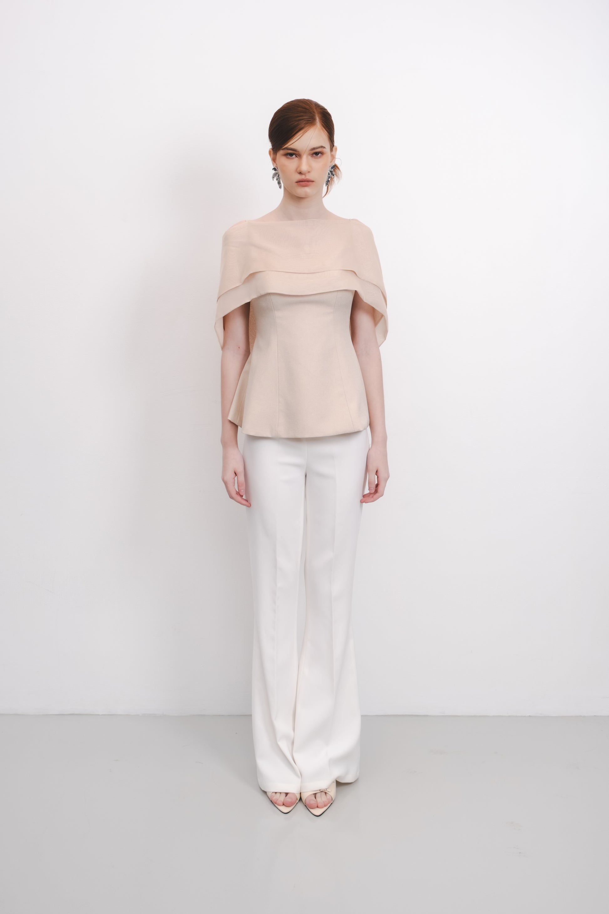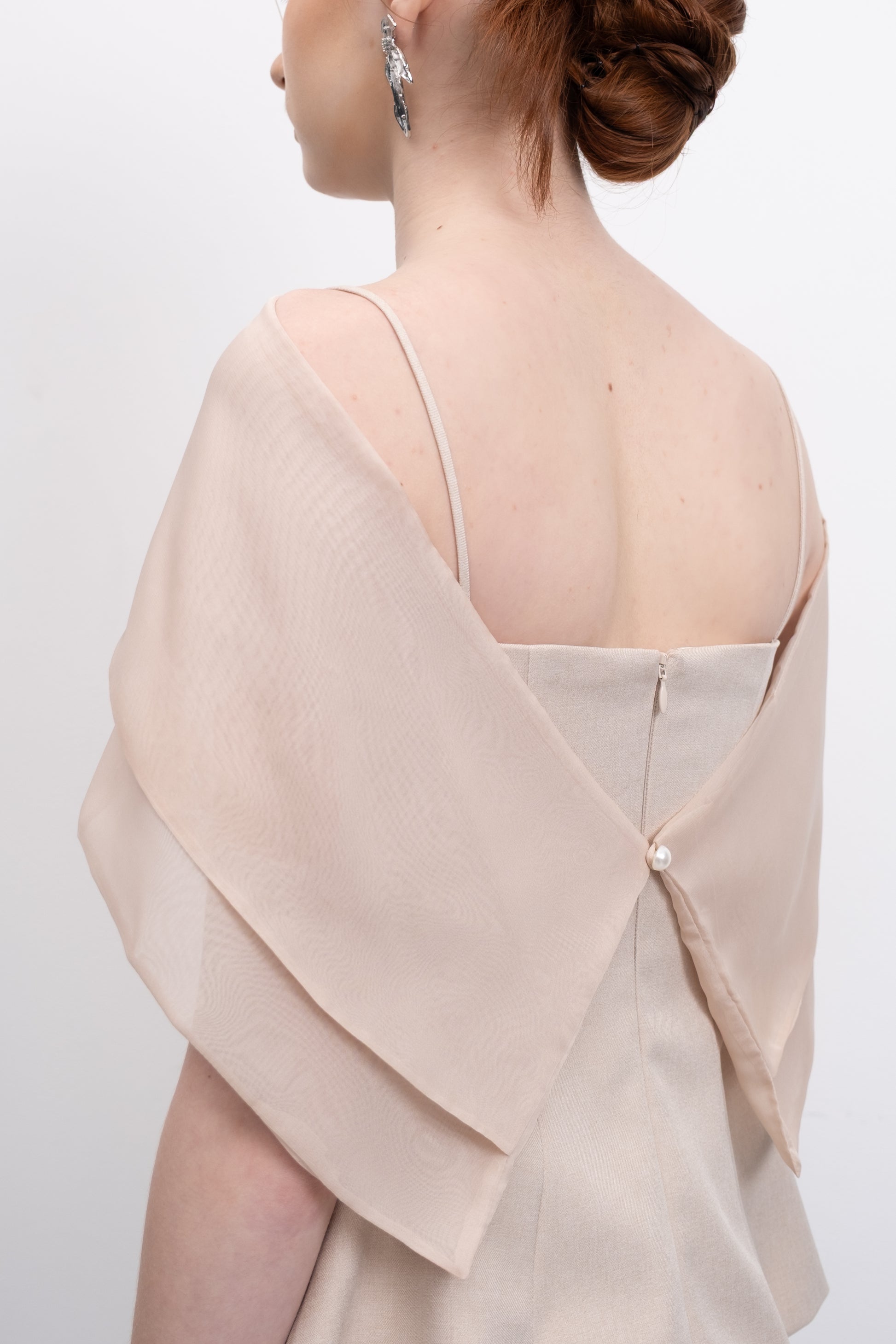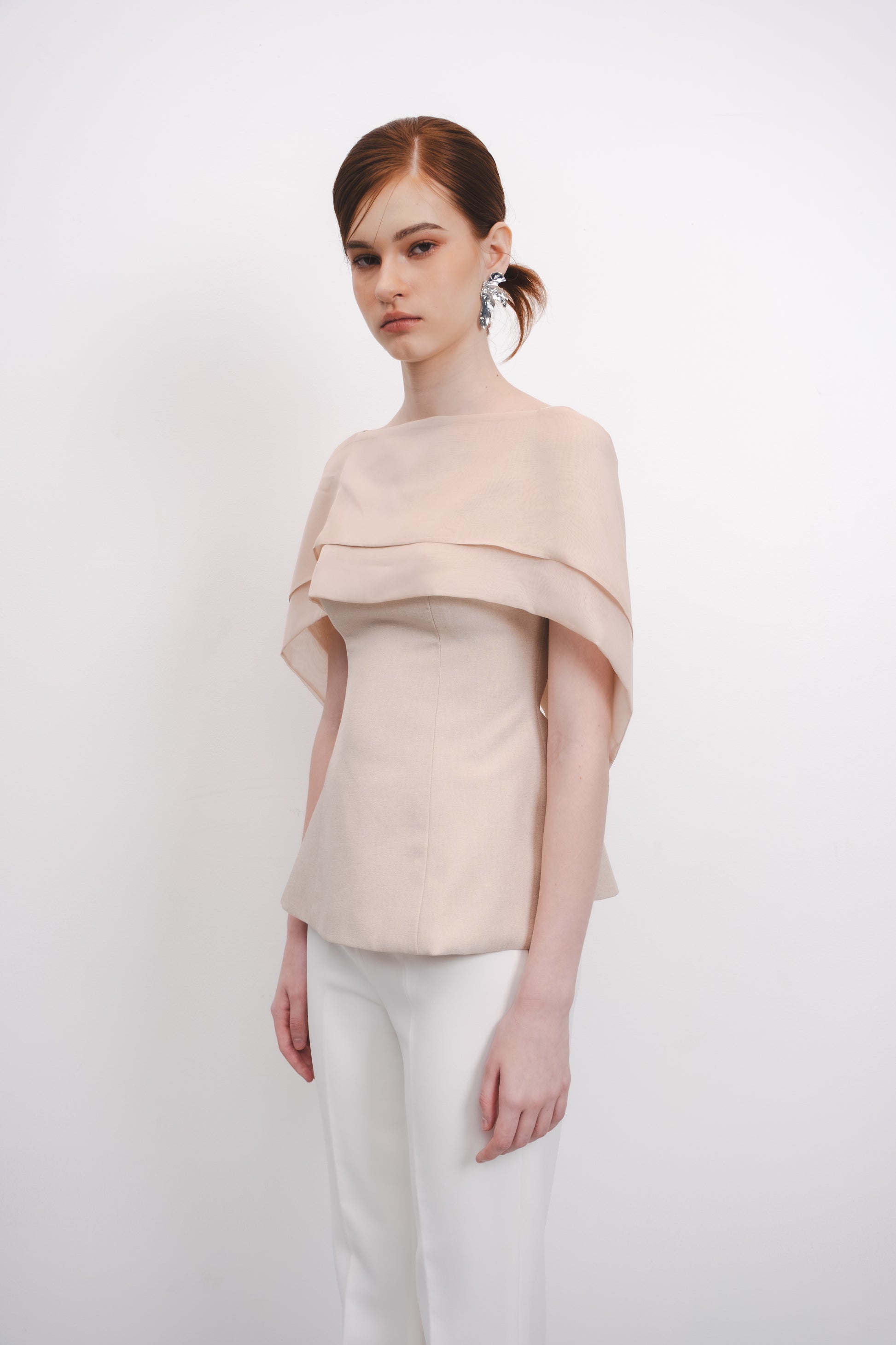 The Amaris Top features a refined silhouette with a subtle peplum detail that enhances the waistline elegantly. Its semi-transparent cape adds a sophisticated layer, offering a delicate balance between coverage and allure. This design combines structure and fluidity, making it a versatile choice for both formal and stylish casual occasions.