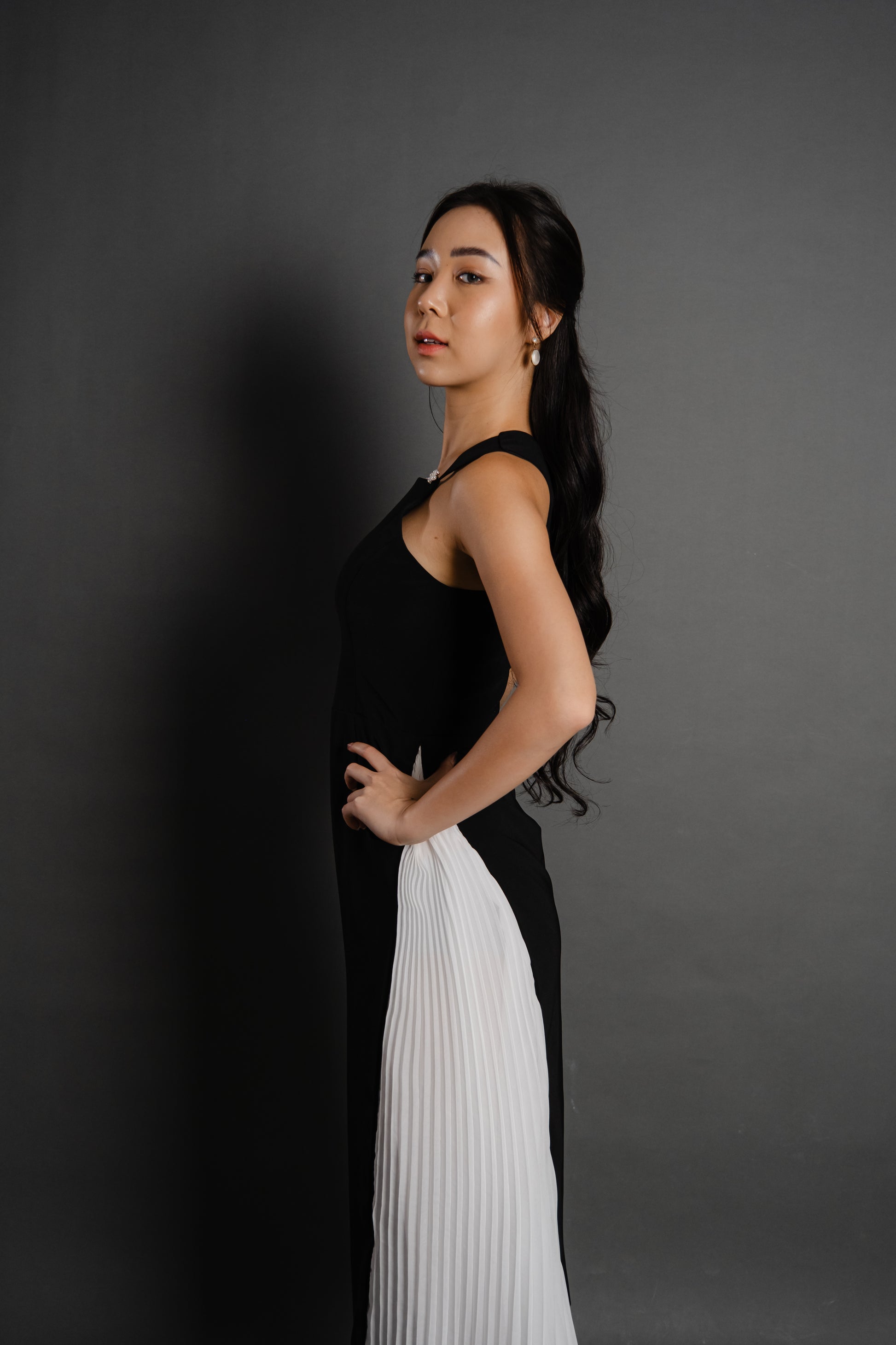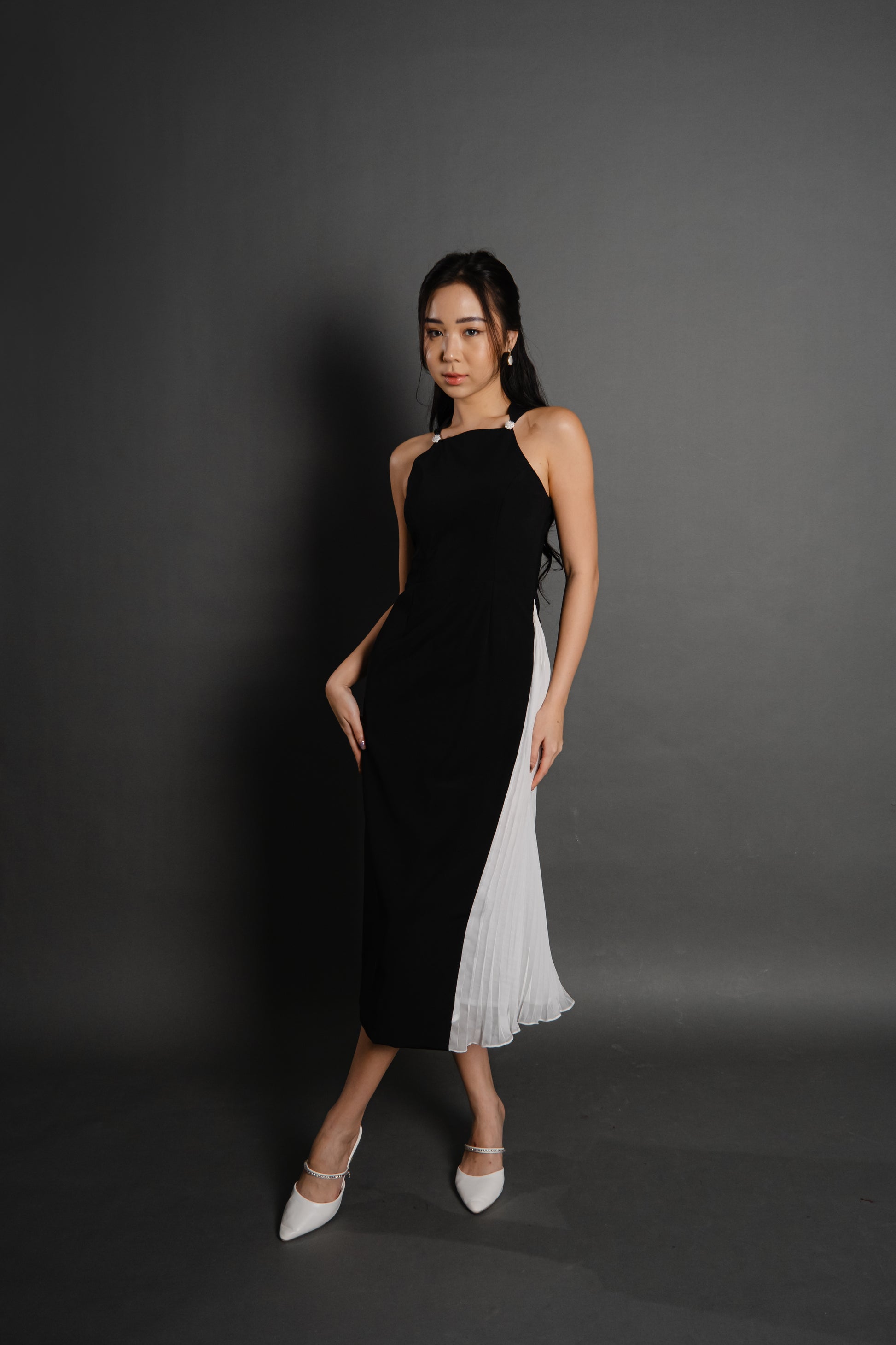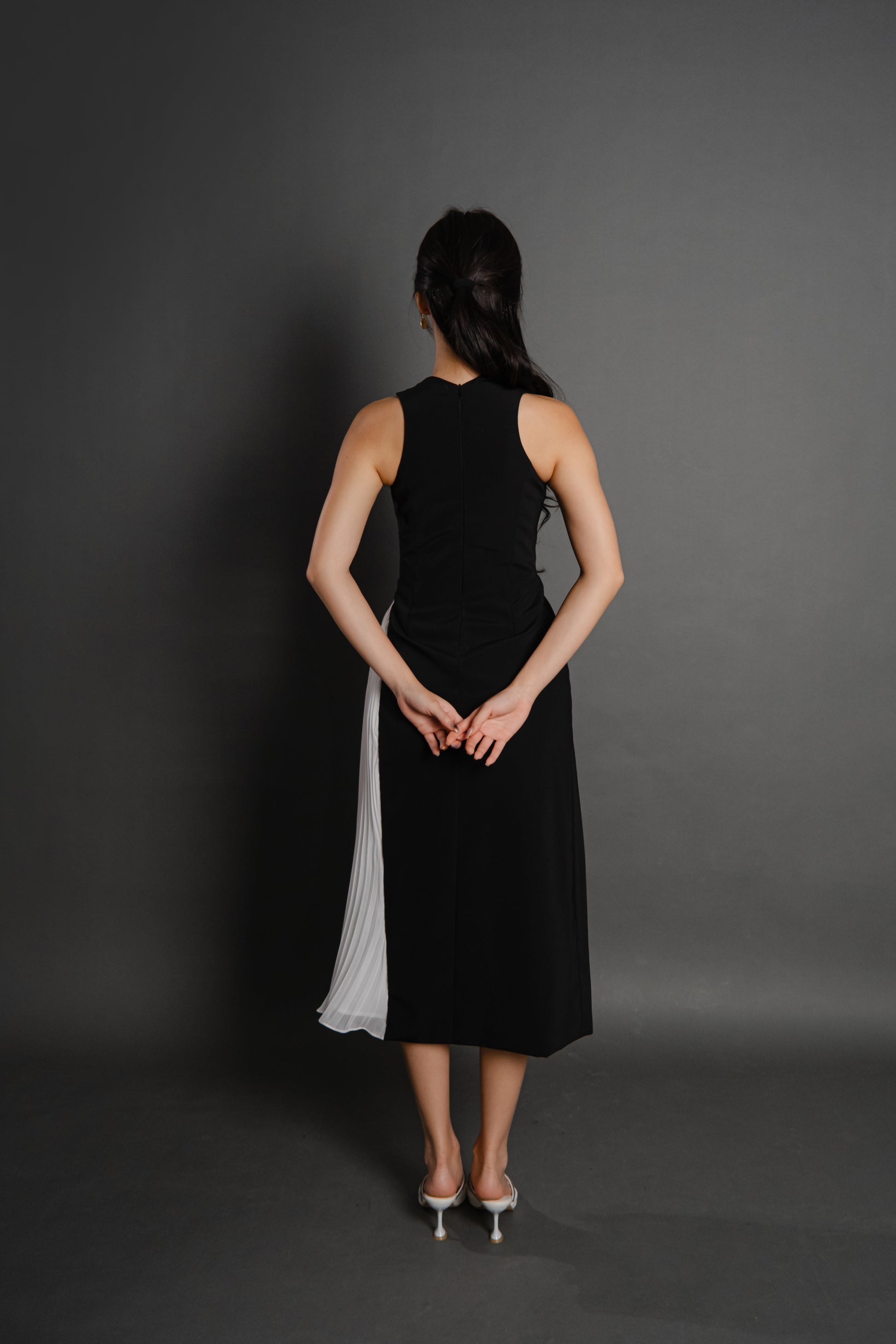 This midi dress features a stylish slit with pleated details, adding a touch of elegance to your ensemble. The statement buttons at the neckline provide a unique and sophisticated touch.