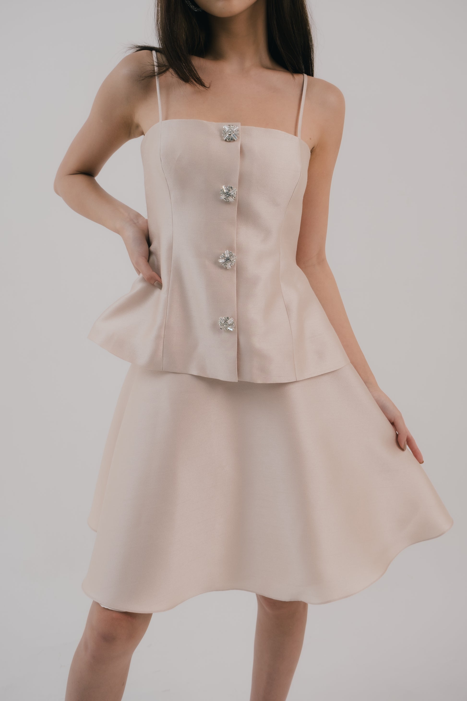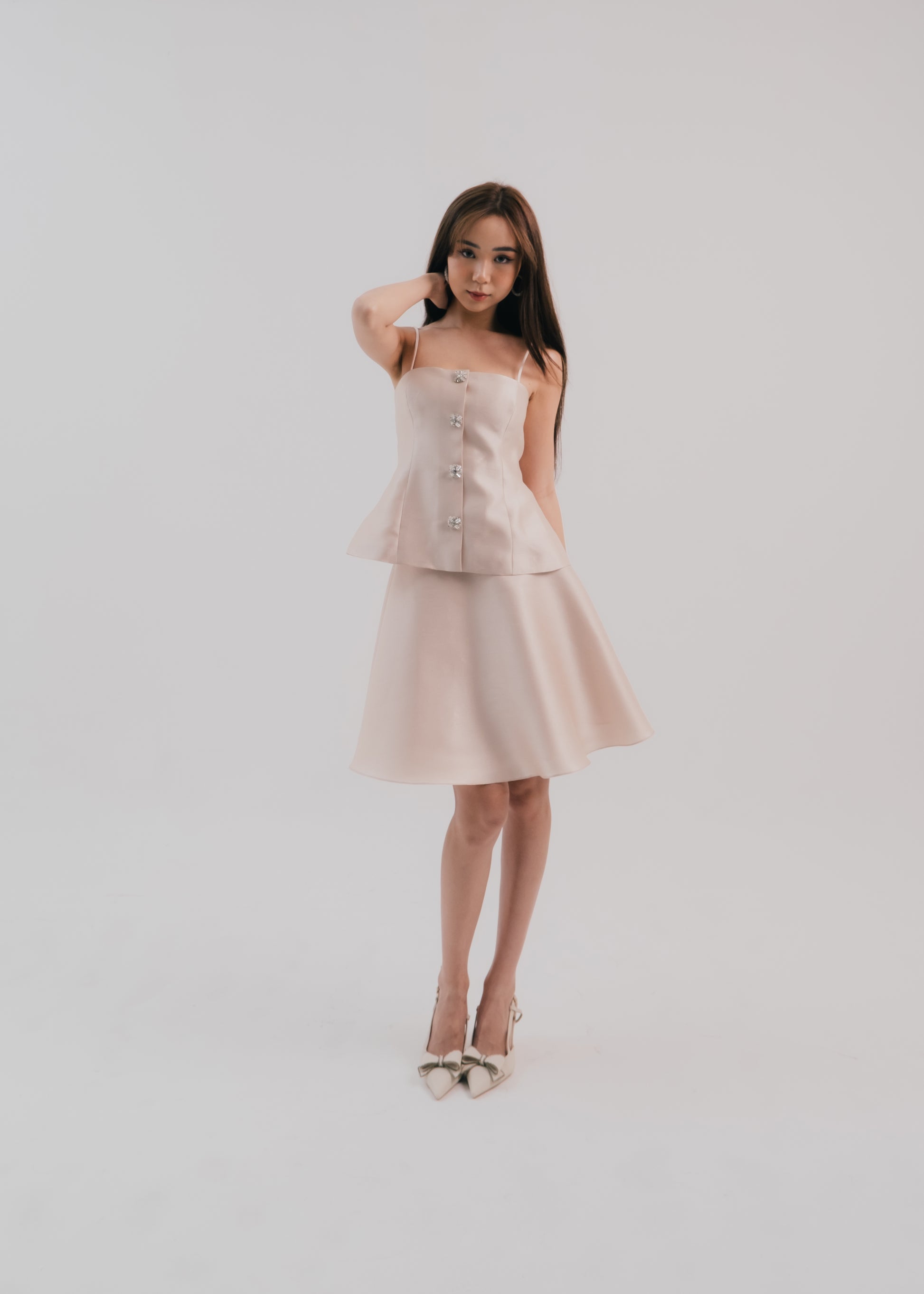 The Chloe Set features striking statement buttons and a flattering A-line silhouette, combining femininity and playfulness. Elevate your style with this versatile set that is sure to make a statement.