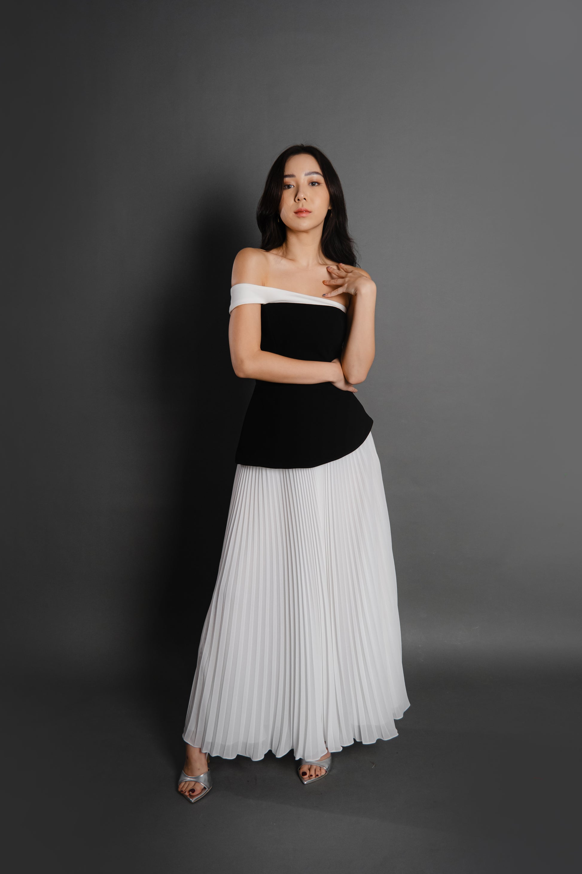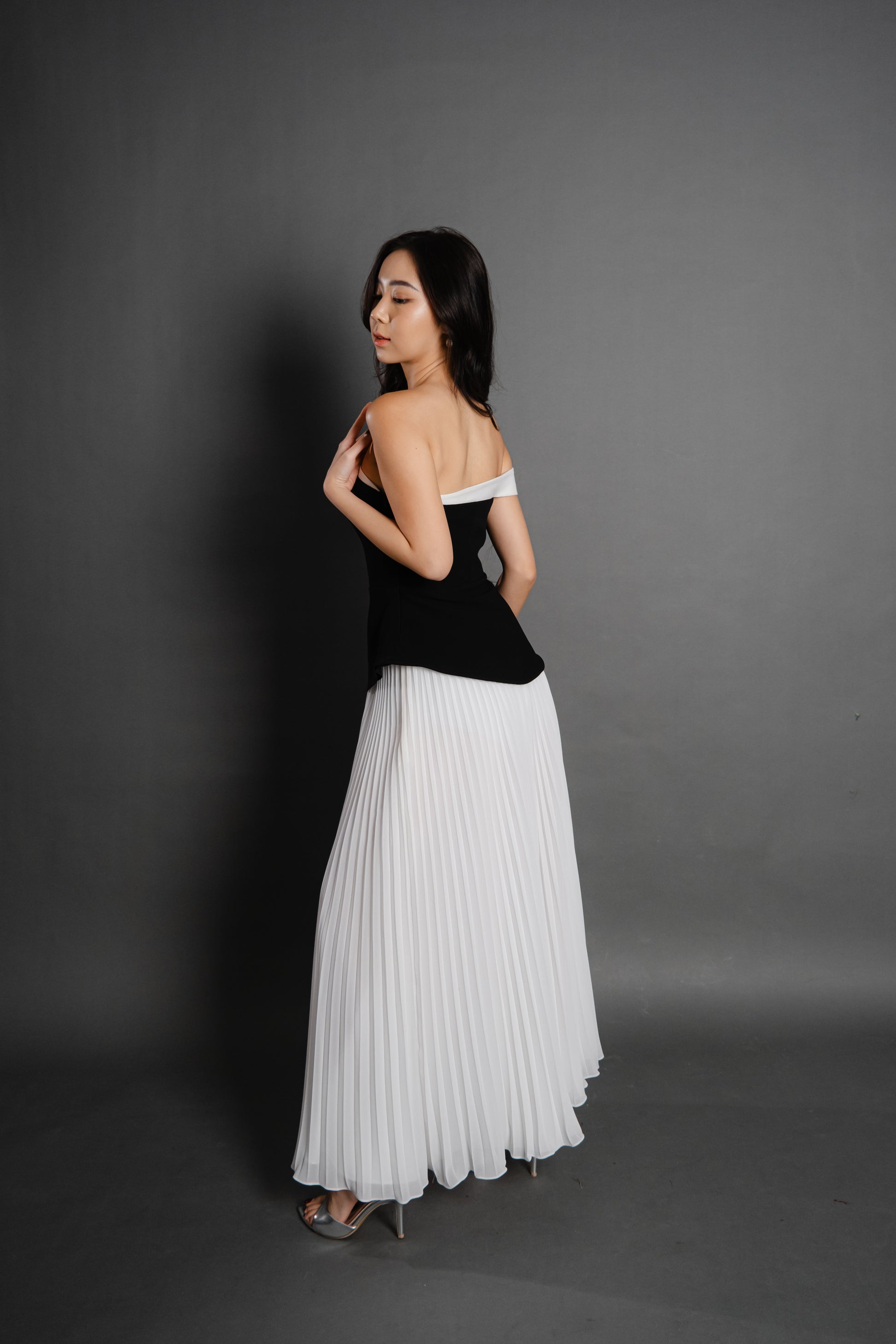 The Clara Top/Skirt/Set is the epitome of modern sophistication. The asymmetric top boasts an asymmetric neckline and a striking black and white design, while the long pleated skirt adds elegance and movement.