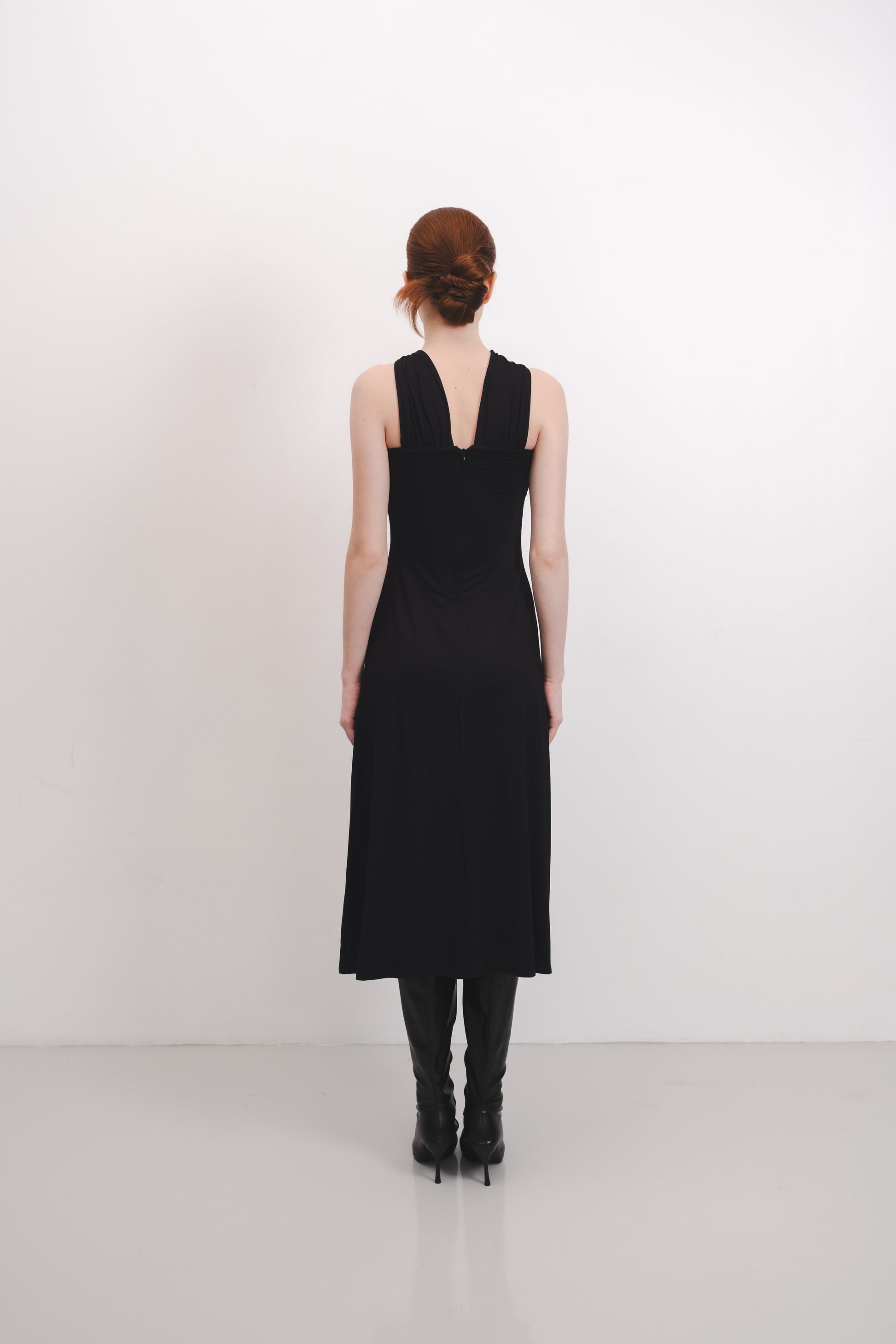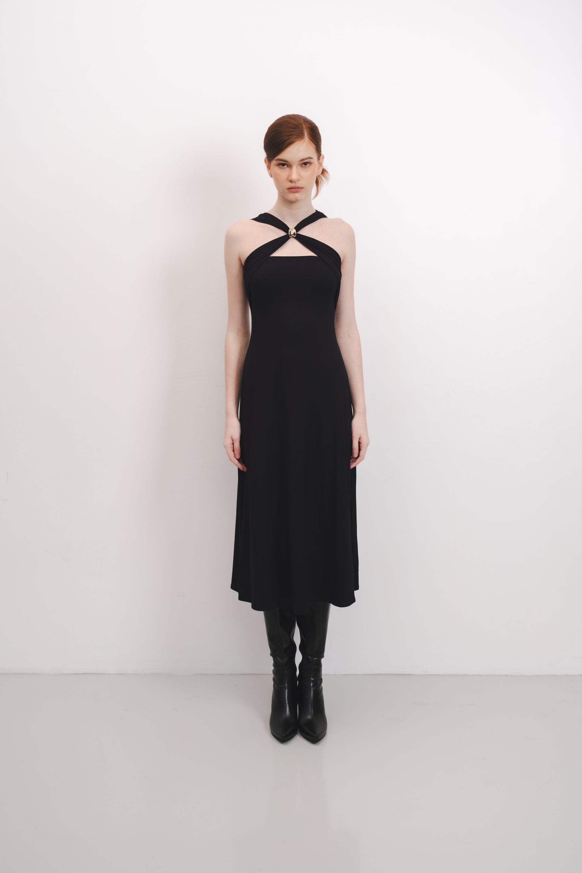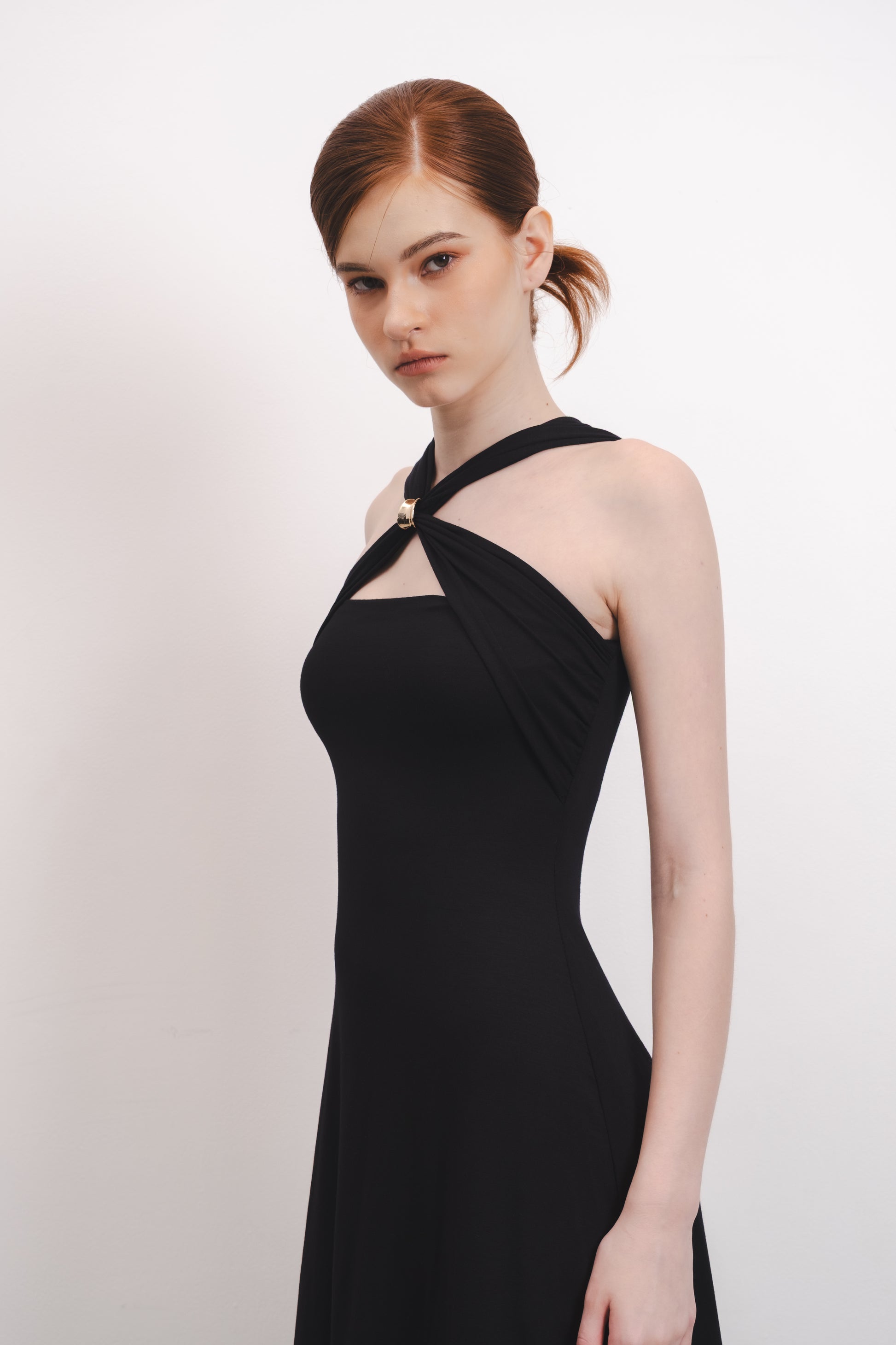 The Cleo Dress features a luxurious buttery-feel fabric that drapes smoothly over the body, offering a flattering, body-hugging silhouette. Its distinctive twist neck detail is complemented by a statement button, adding a sophisticated focal point to the design.