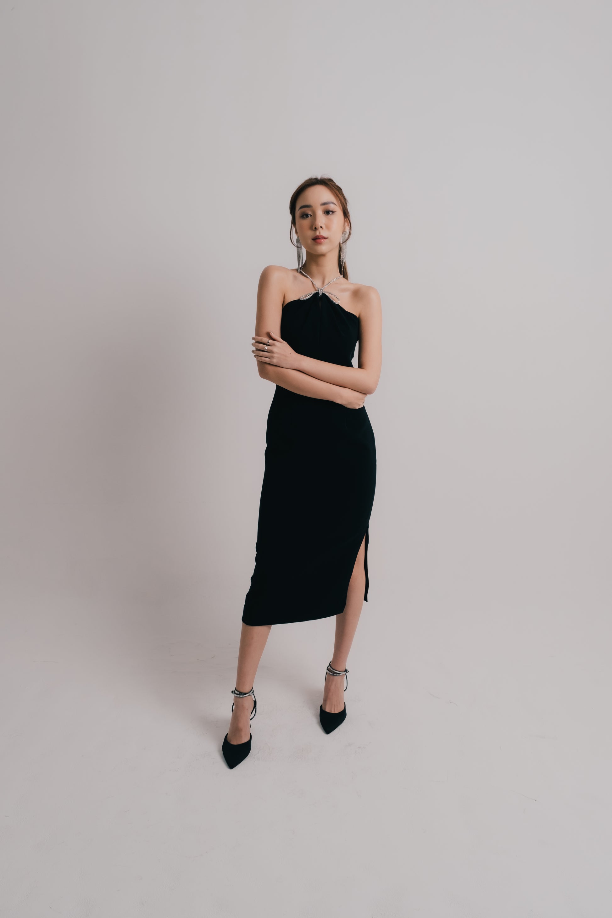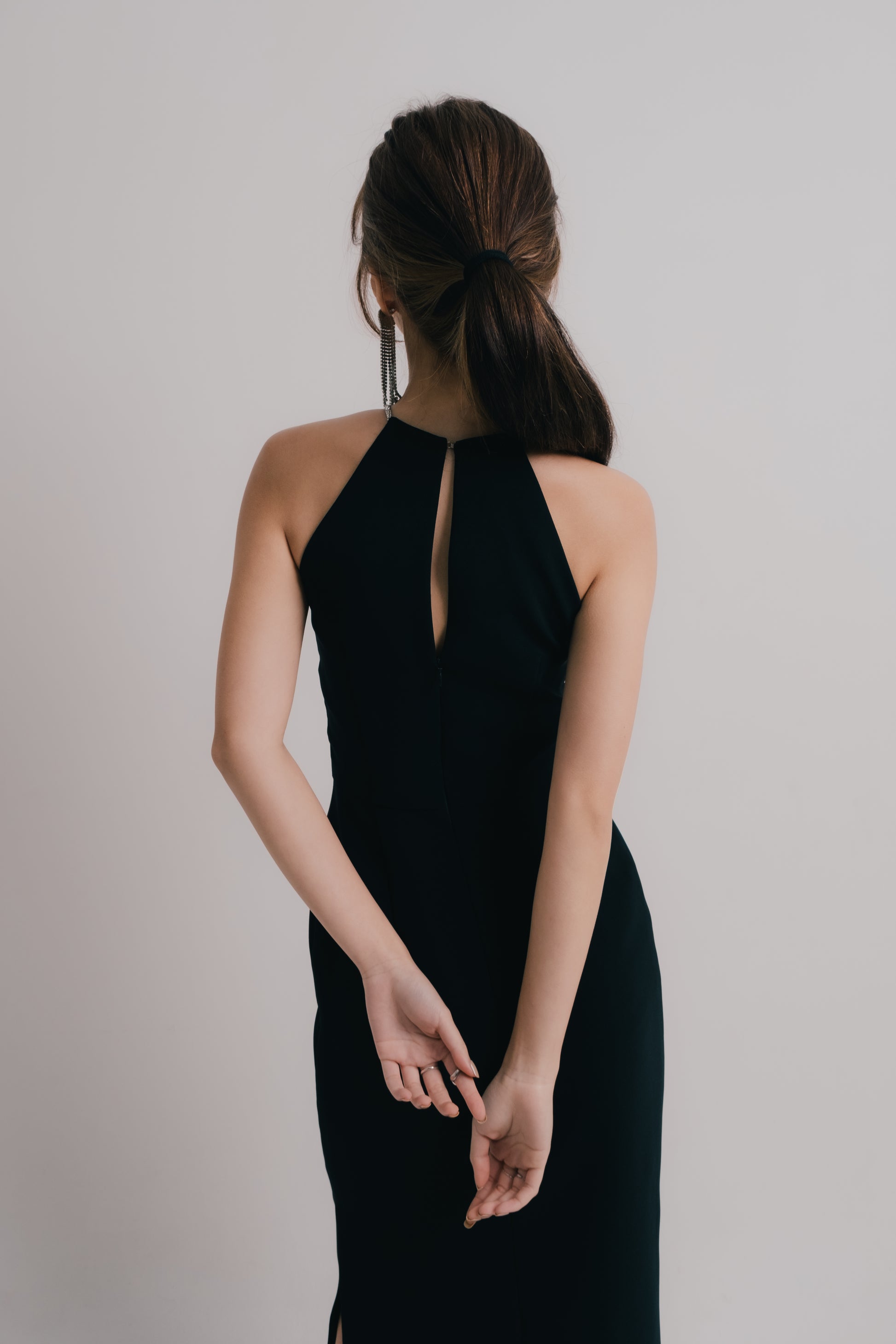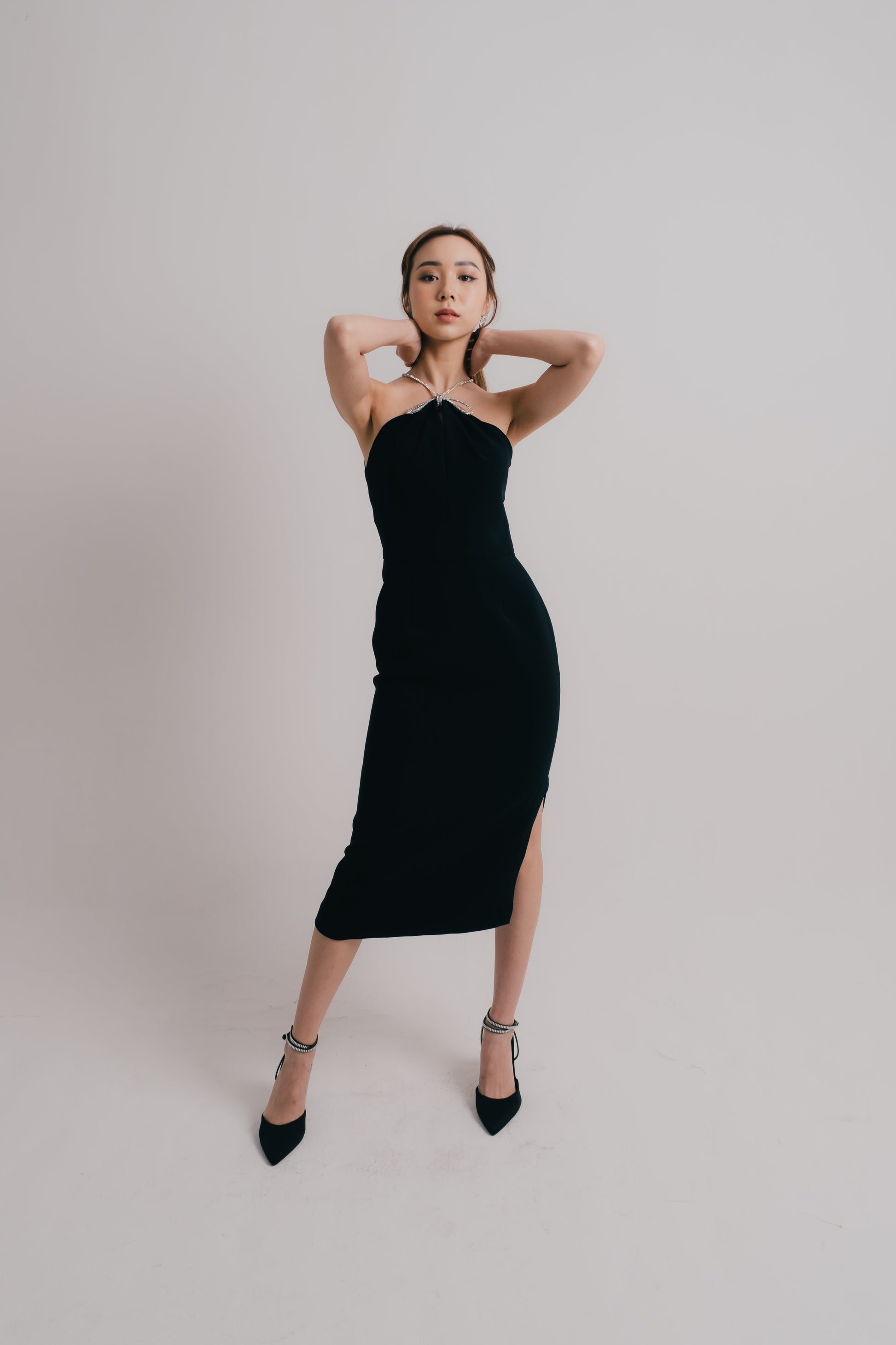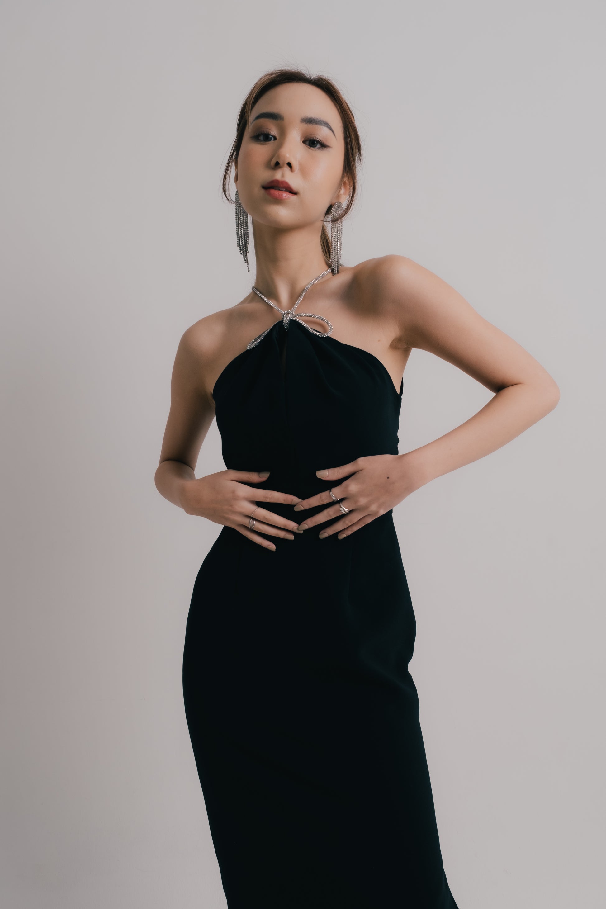 Expertly crafted with a sleek midi length and a timeless black hue, the Isla Dress exudes effortless elegance. The halter neck, adorned with a delicate silver bow, adds a touch of glamour to the fitted silhouette.