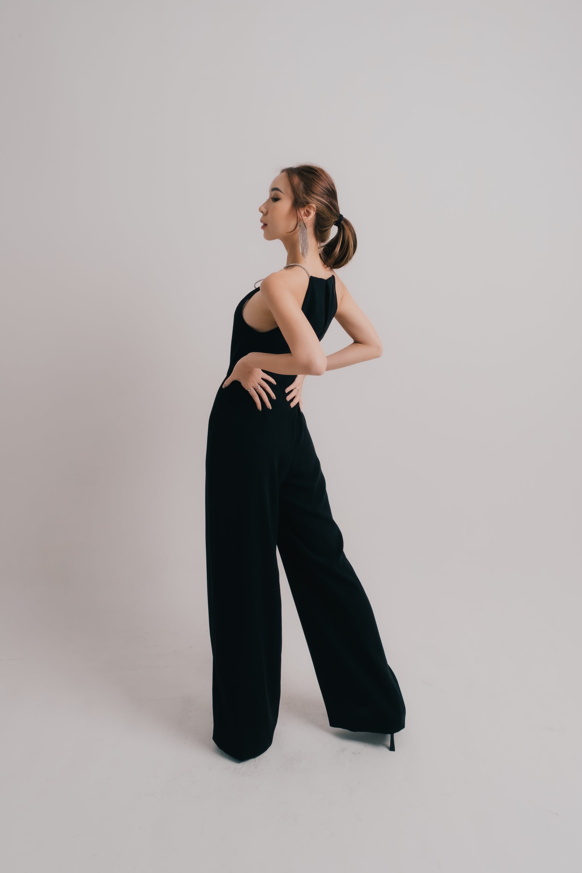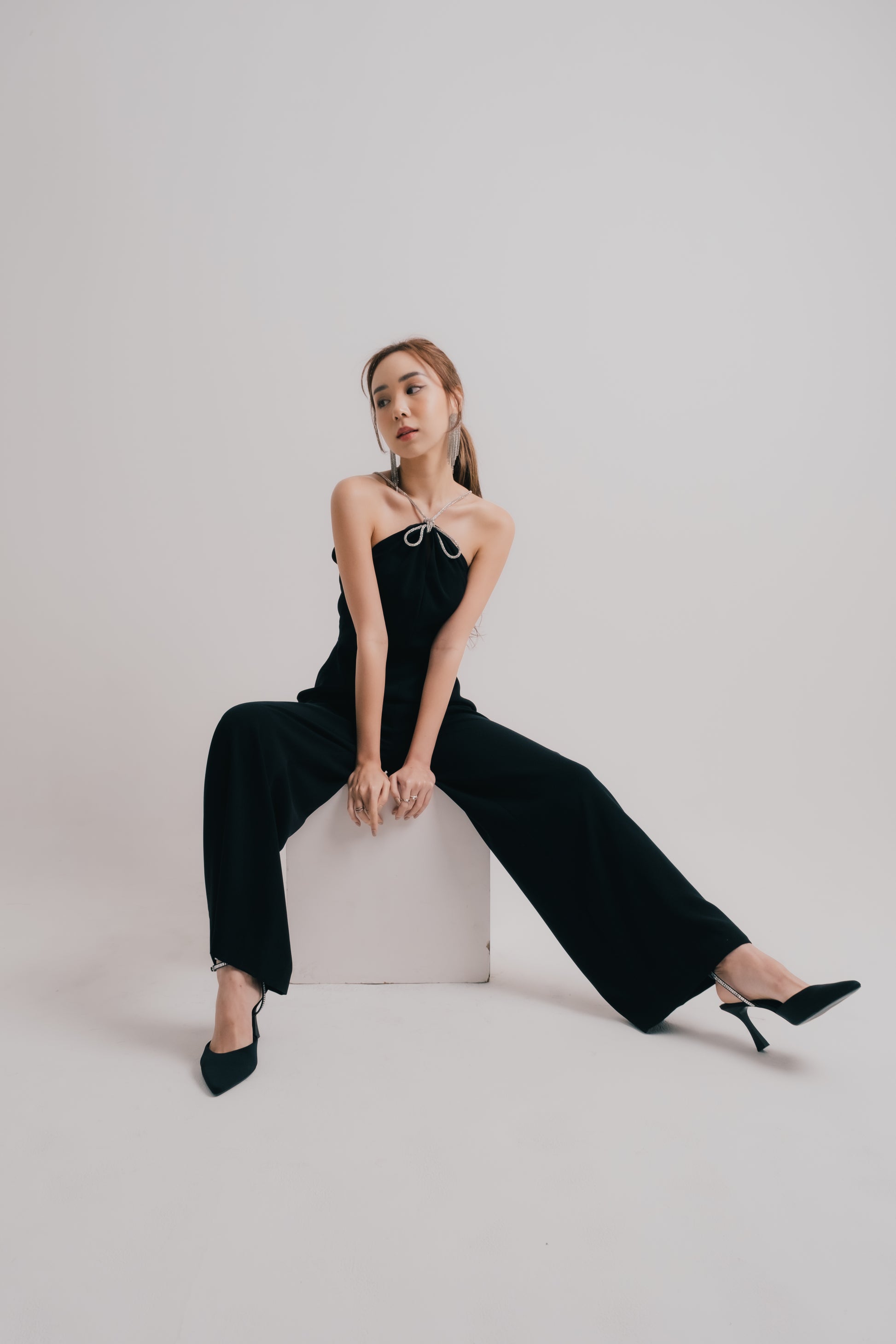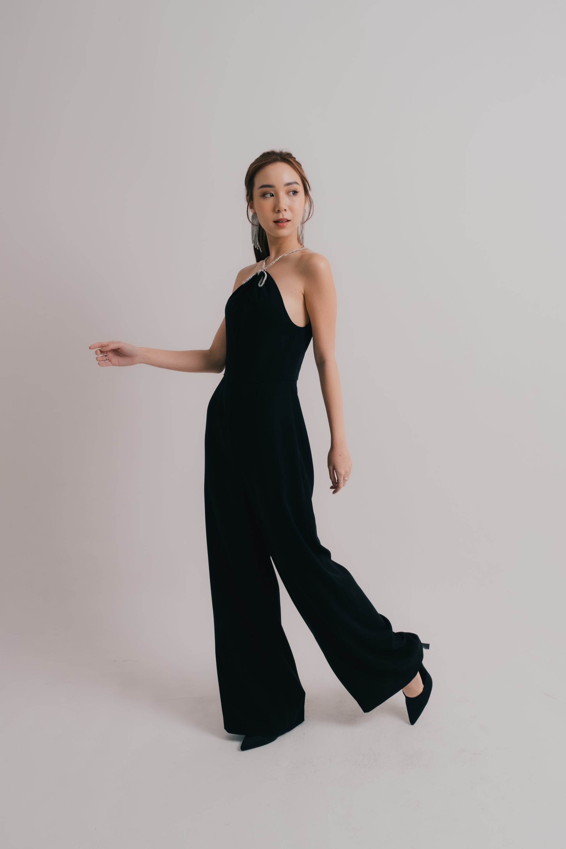 The Isla Jumpsuit is a stylish and versatile addition to your wardrobe. With its sleek black design, elegant halter neck, and silver bow detailing, this long jumpsuit is perfect for any occasion. Its chic yet comfortable fit will make you stand out and feel confident.