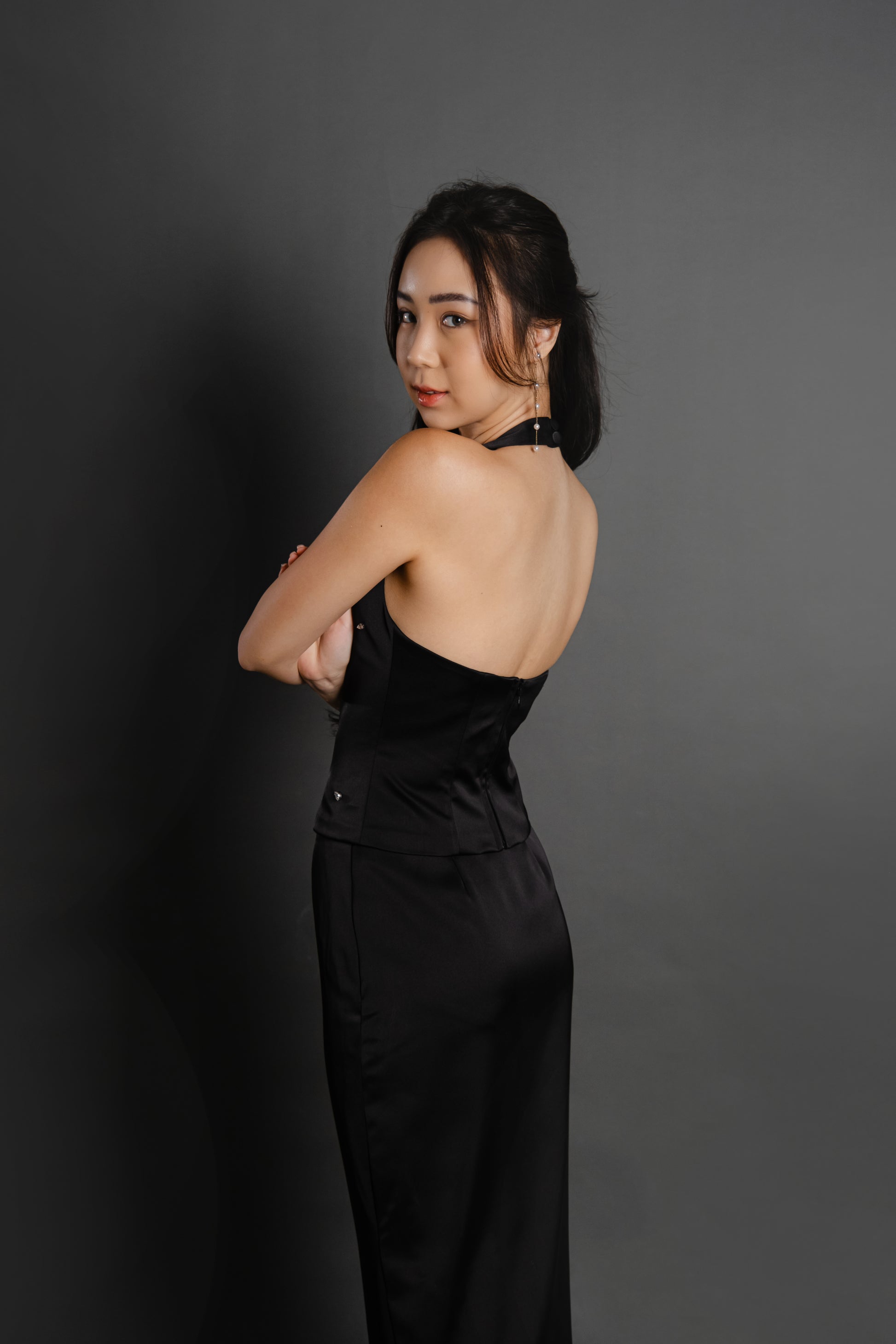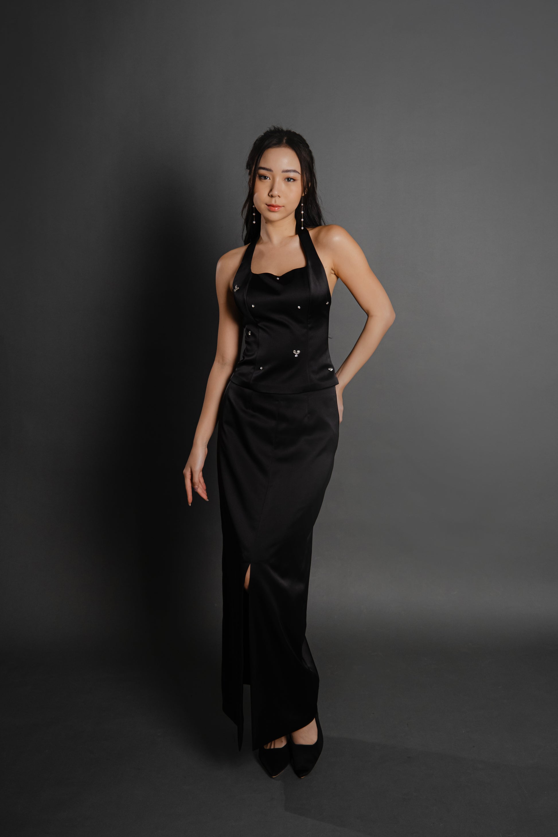 Expertly crafted with a satin material, the Jade Top/Set features a halter square neckline and delicate bead detailing. Paired with a long fitted skirt, this set exudes elegance and sophistication.