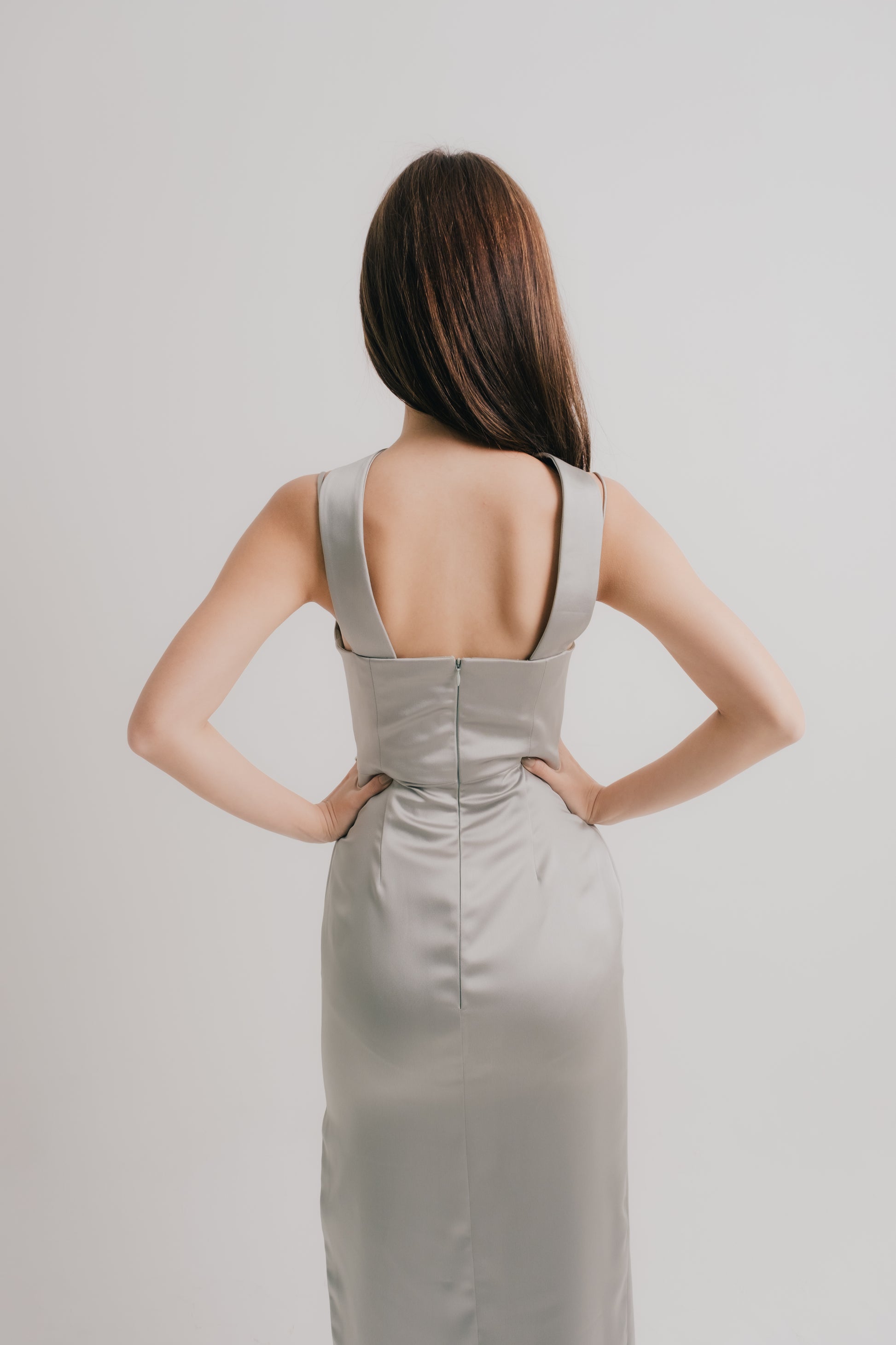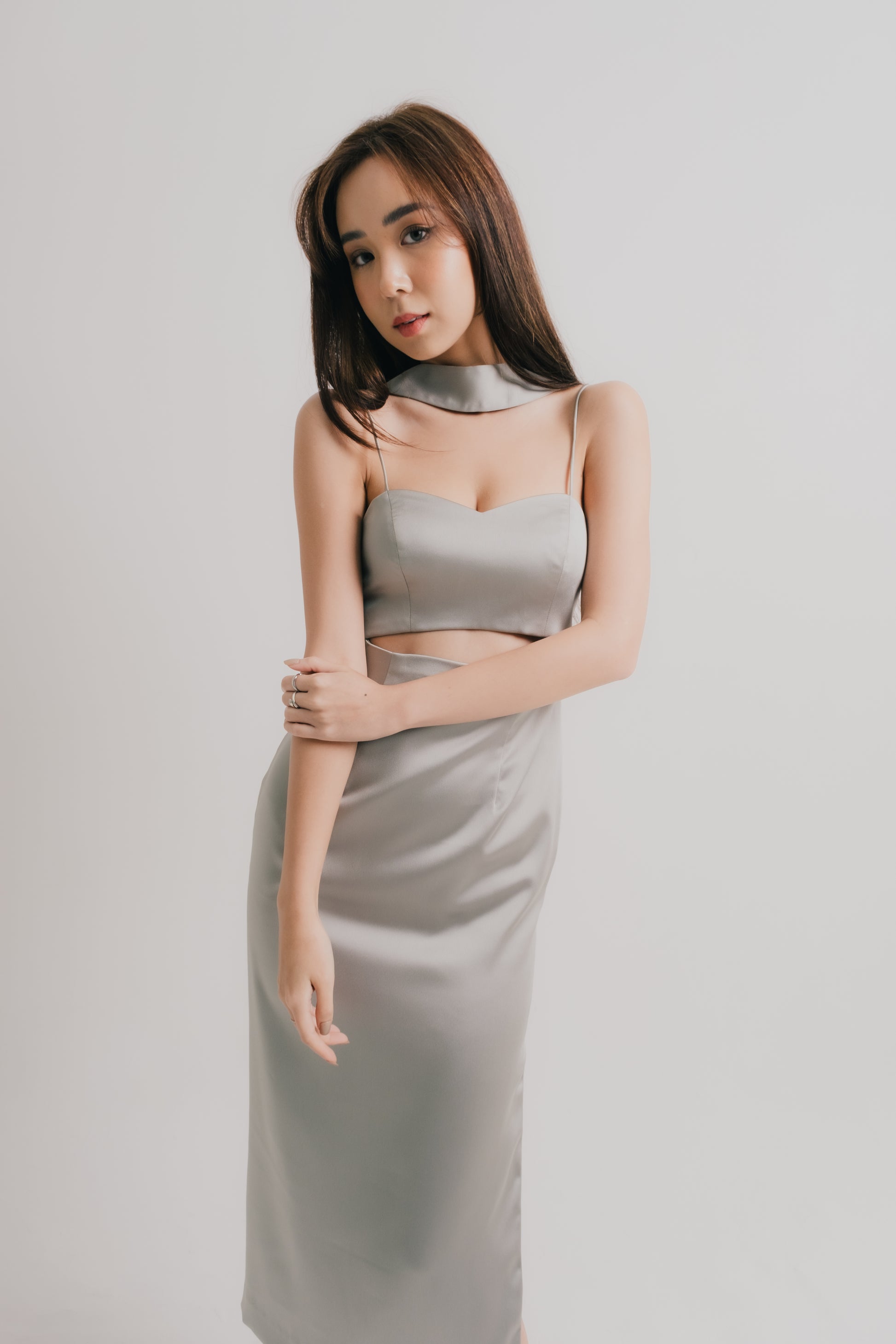 This midi dress flatters with a fitted silhouette and adds a touch of allure with its unique cut out design around the waist in front. The scarf design adds a delicate touch, making this dress perfect for any formal occasion.