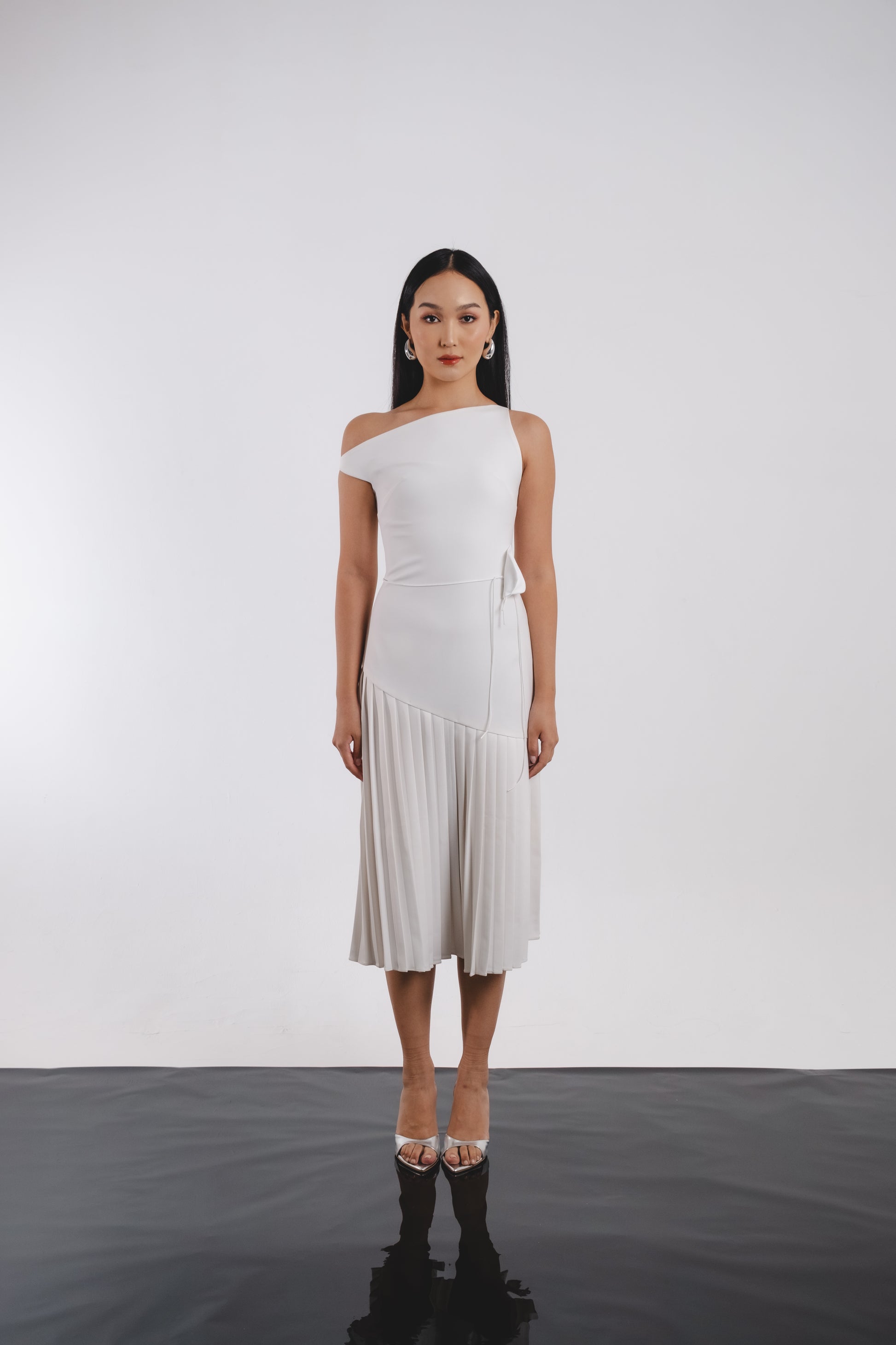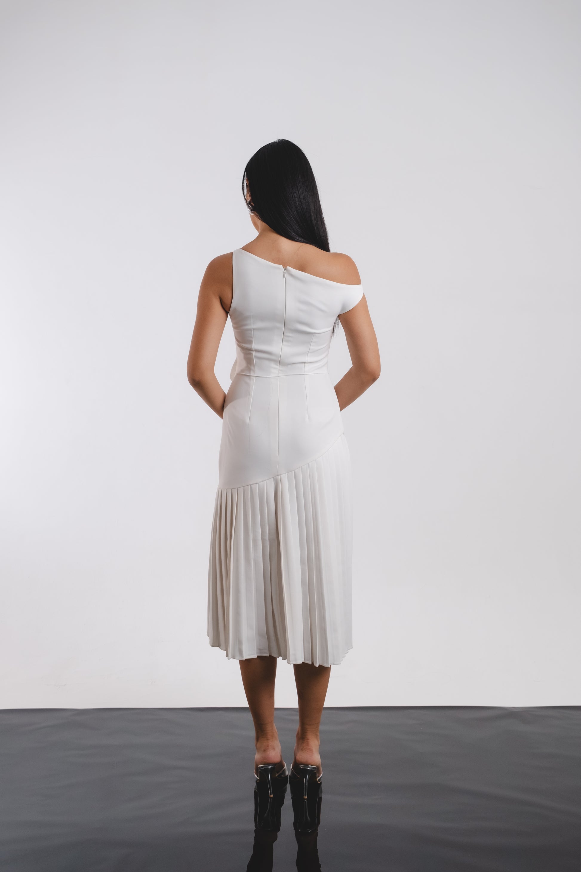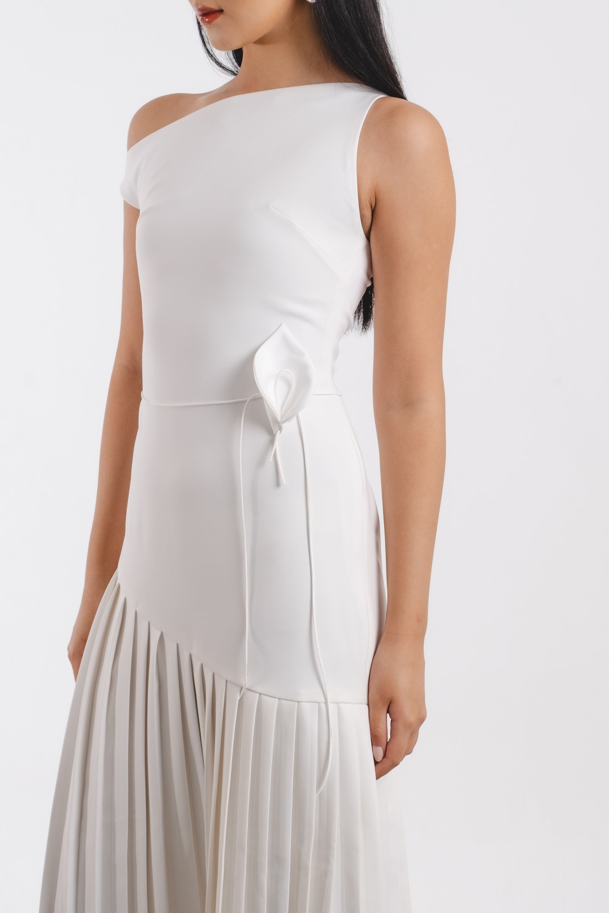Expertly designed for a sophisticated look, the Leah dress in white is a must-have addition to your wardrobe. Crafted with an asymmetric neckline and pleated bottom, this midi dress exudes elegance. Complete your ensemble with the detachable flower belt for a versatile styling option.