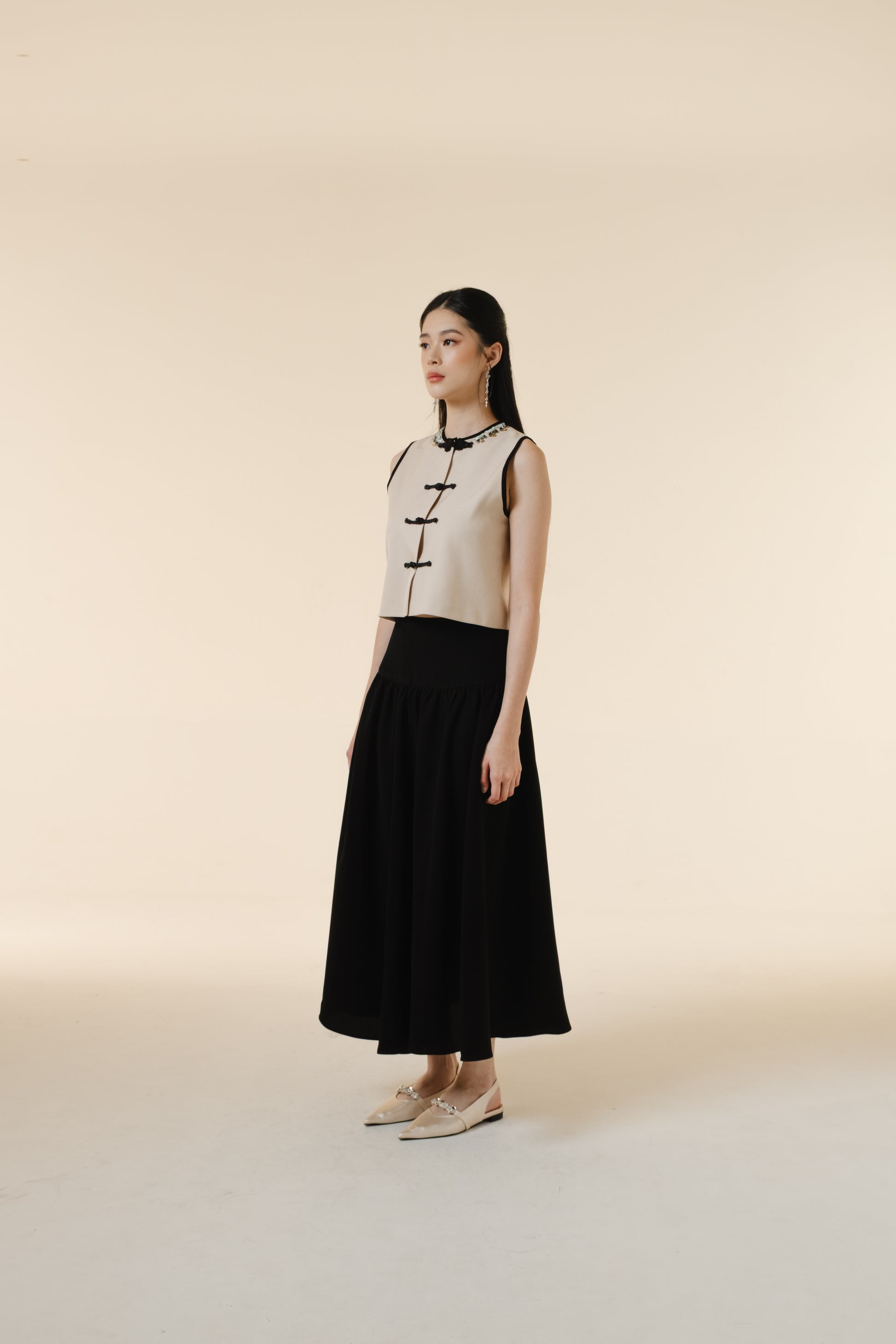 The Rui Skirt presents an elegant A-line design in timeless black, distinguished by its bold pleating that originates at the hip. This strategic placement creates a flattering silhouette while allowing the pleats to flow gracefully downward, offering both visual dimension and comfortable movement. The structured detailing at the hip provides subtle shaping before transitioning into the skirt's fluid lines.