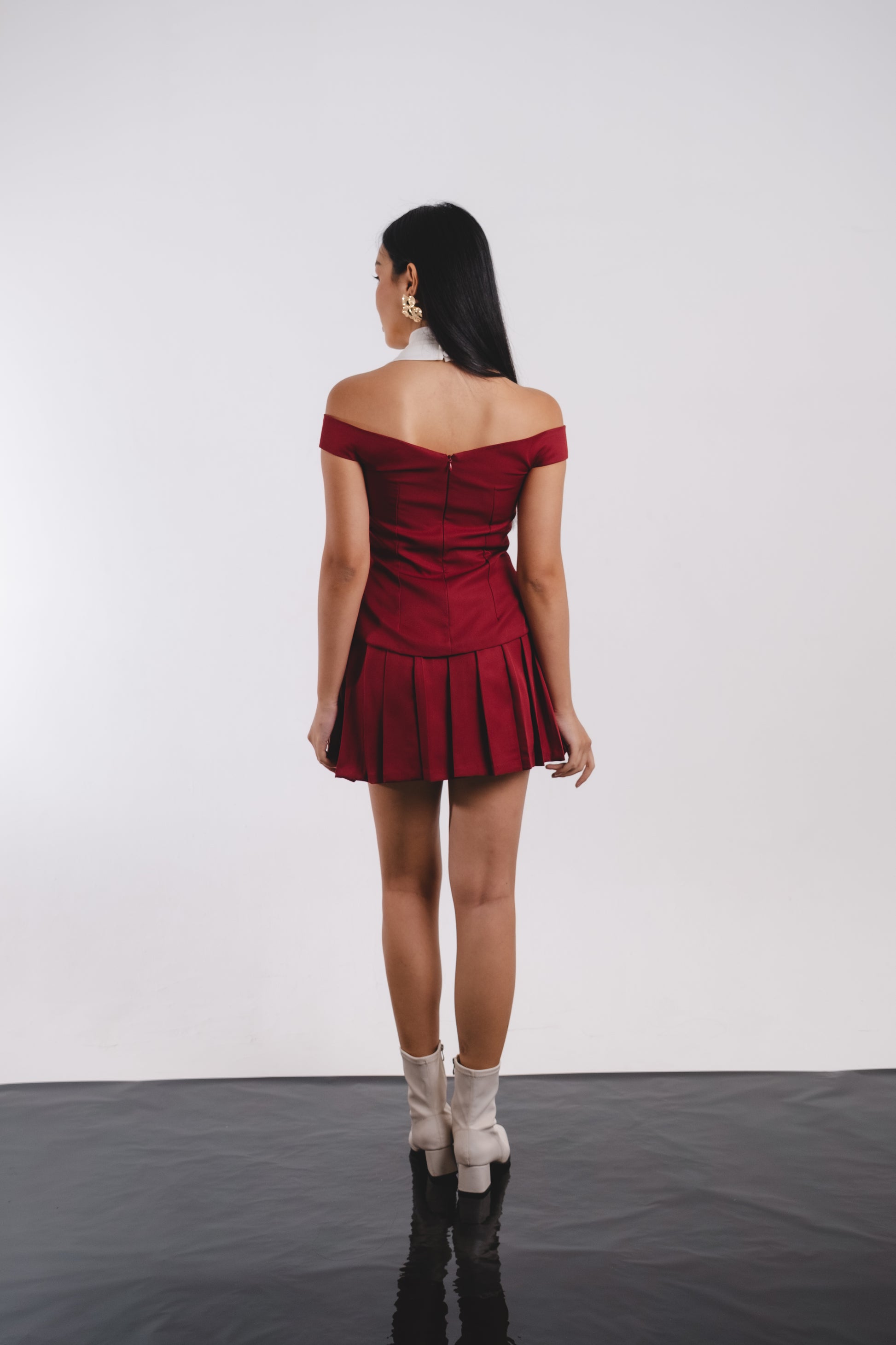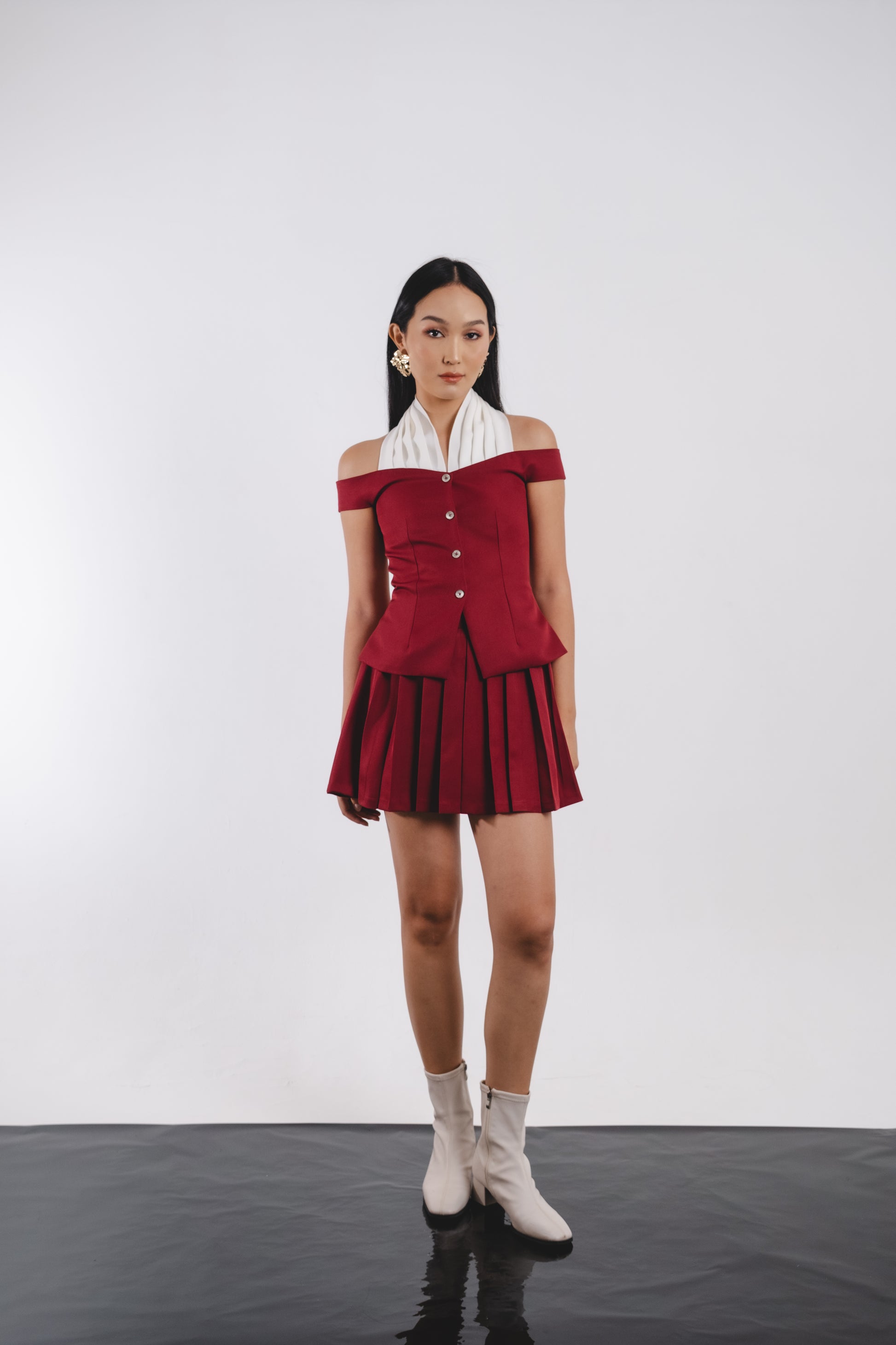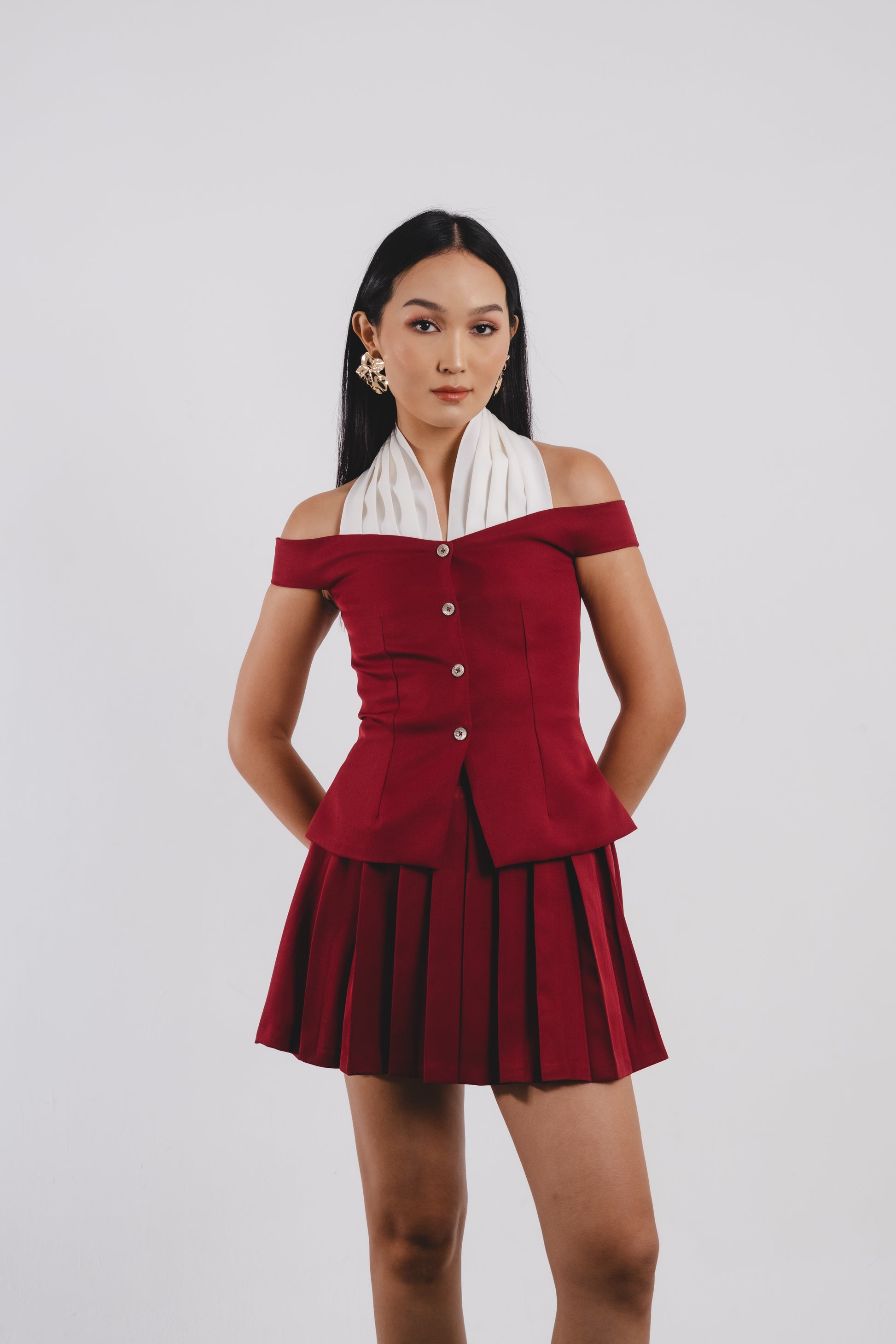 Introducing the Sadie Top in Maroon. This elegant top features a white halter with a drapped detail, statement buttons, and a peplum design for a flattering silhouette. Elevate your wardrobe with this sophisticated and versatile piece.