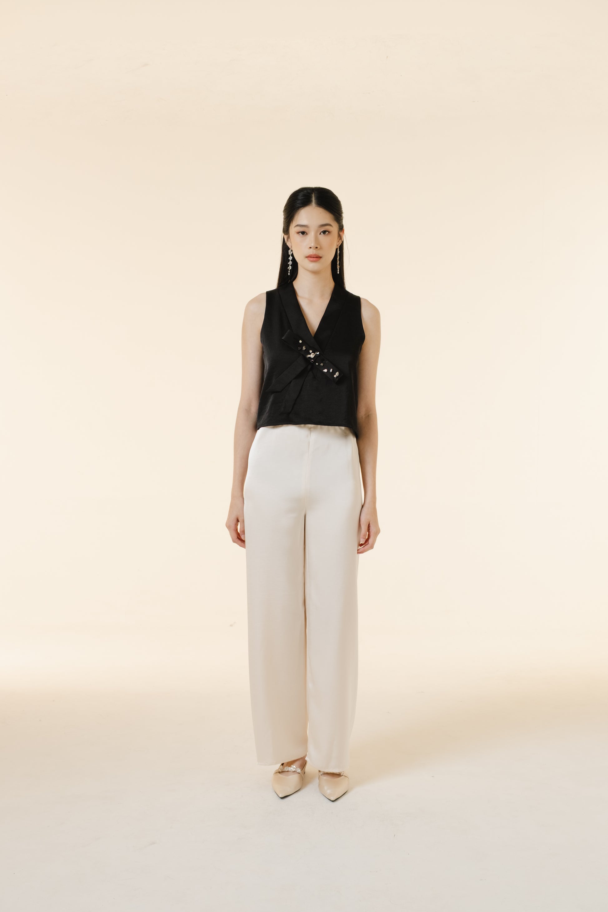 The Yue Set pushes elegance into bold territory with its striking black and champagne satin construction. This daring ensemble features a V-neck top that commands attention with an intricate bow detail adorned with beads—a statement piece that refuses to blend in. Paired with matching satin pants, this set delivers unapologetic sophistication for those who embrace standout style. Premium satin fabric ensures the look feels as confident as it appears, making this the perfect choice for those ready to make an impression.
