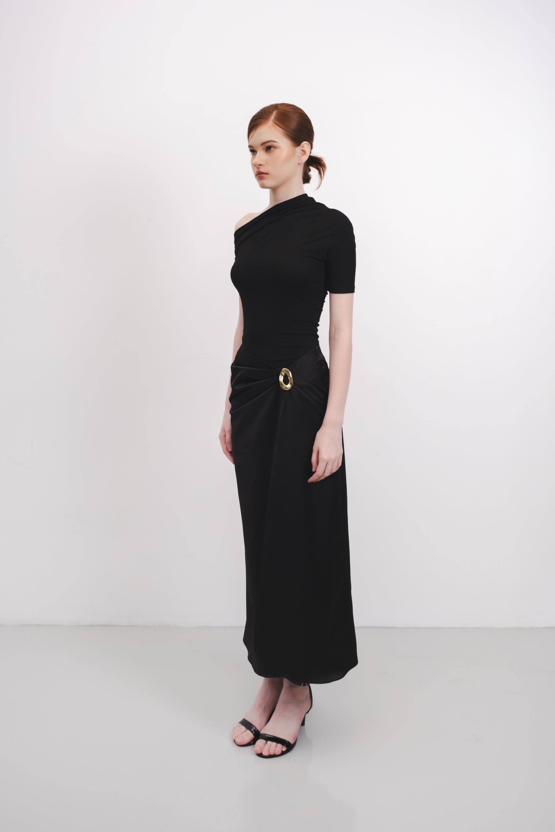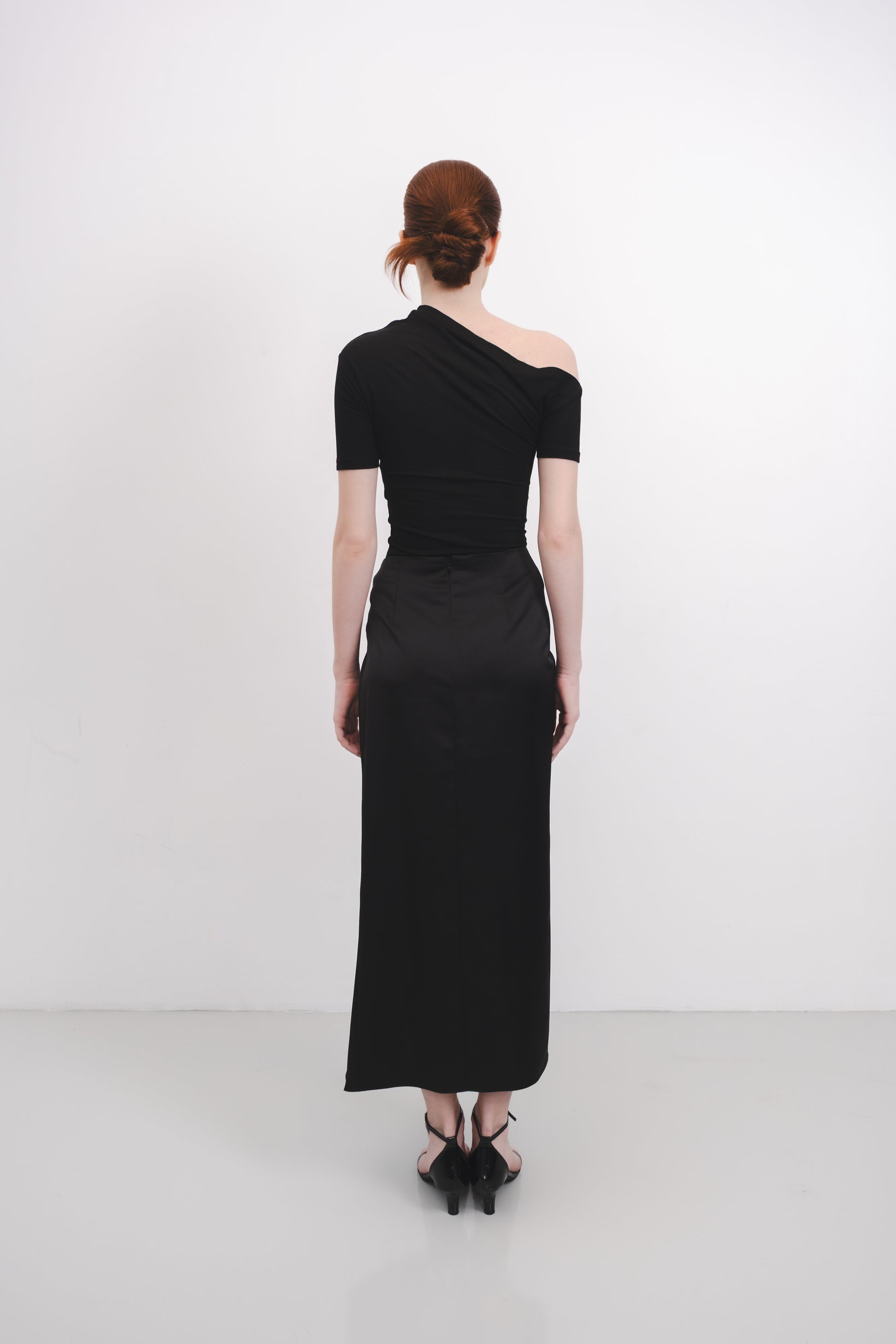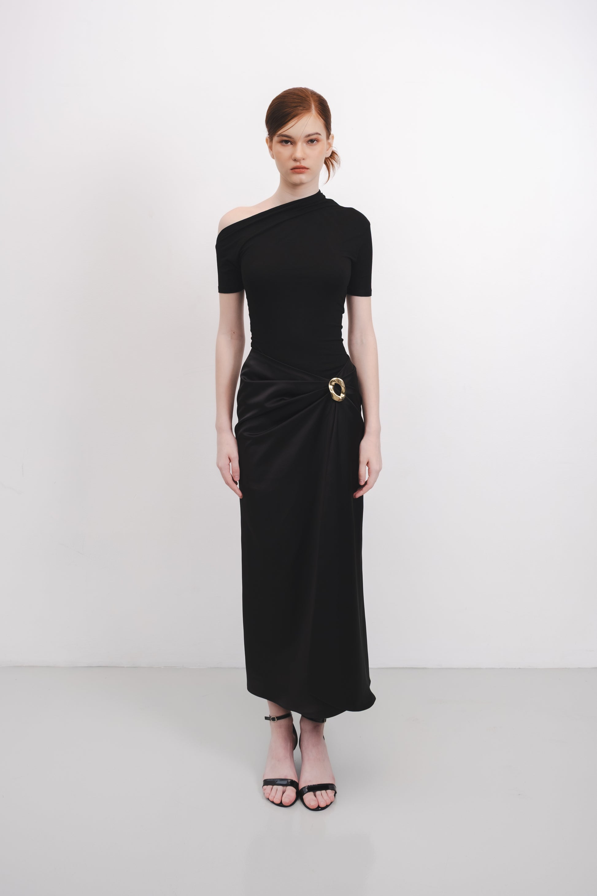Crafted from smooth satin, the Yves Skirt in black features elegant draped detailing at the waist that enhances its refined silhouette. The pencil cut flatters the figure, while a distinctive statement pin adds a touch of sophistication.